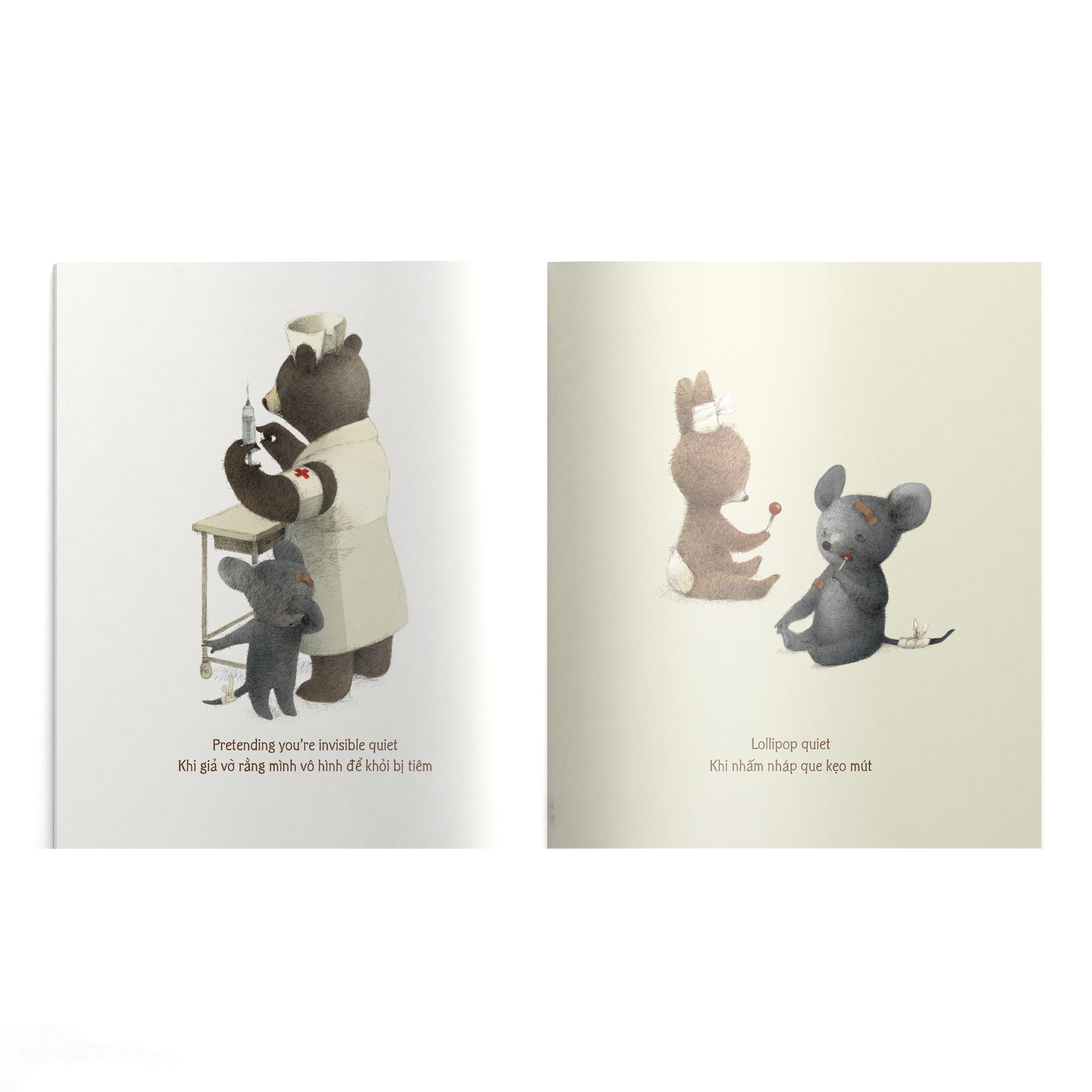 Cuốn sách là bộ sưu tập những khoảng lặng mà bất kỳ ai cũng có thể bắt gặp trong đời: khi là người đầu tiên thức giấc, khi rỉ tai nhau những bí mật, khi chăm chú tô màu… Và còn những khoảnh khắc im lặng nào khác nữa, mời các em cùng khám phá nhé.