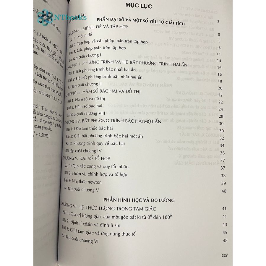 1. Nội dung sách Tự học Toán học lớp 10: Tập 1: - Chương 1: Mệnh đề và tập hợp (5 chủ đề) - Chương 2: Bất phương trình - Hệ bất phương trình (4