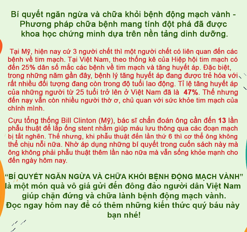 Giải quyết Bệnh Động mạch vành thông qua phương pháp: CHỮA BỆNH MANG TÍNH ĐỘT PHÁ ĐÃ ĐƯỢC KHOA HỌC CHỨNG MINH DỰA TRÊN NỀN DINH DƯỠNG THỰC VẬT TOÀN PHẦN.