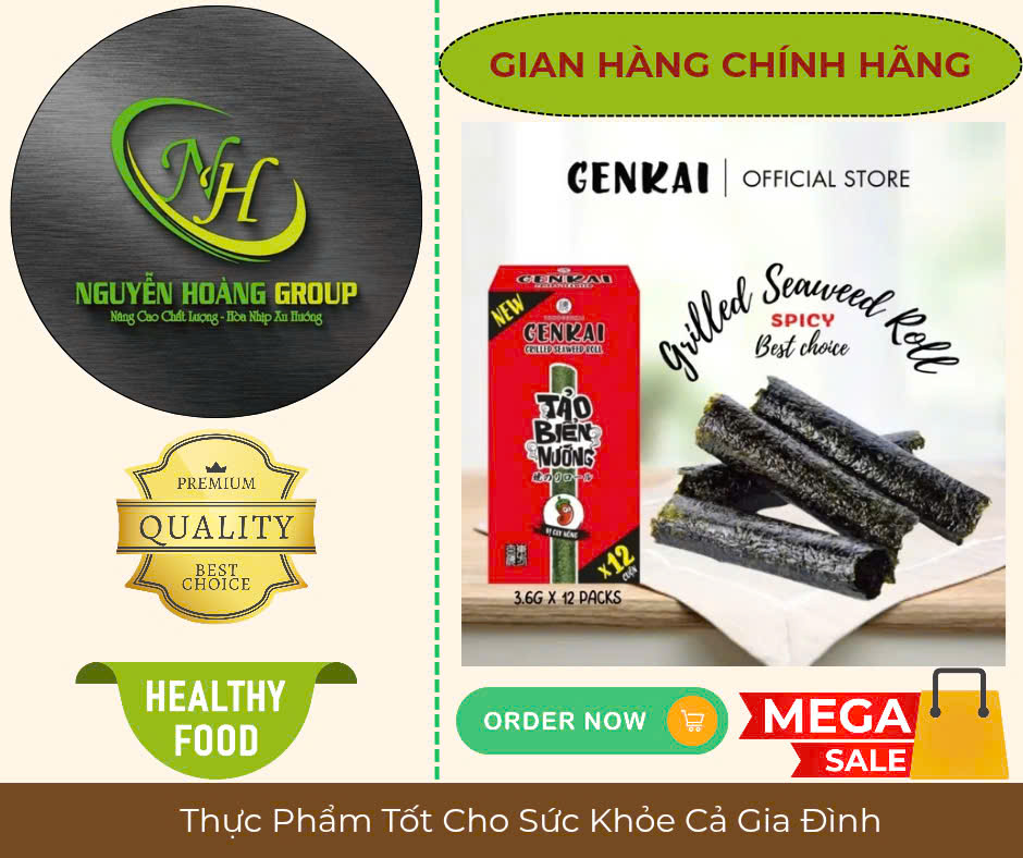 Tên sản phẩm: RONG BIỂN NƯỚNG CUỘN Có 2 Vị : Tự Nhiên & Vị Cay NÓNG Thành phần: Rong biển 68%, dầu ngô 26.7%, dầu mè 4.3%, muối biển 1% Lá Rong biển có
