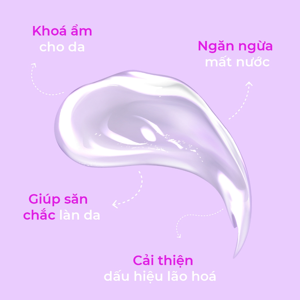Công dụng: + Cung cấp và duy trì độ ẩm cho da nhờ Hyaluronic acid, giúp giữ cho da căng mọng mịn màng. Đồng thời có khả năng giảm tình trạng mụn, giúp da chống