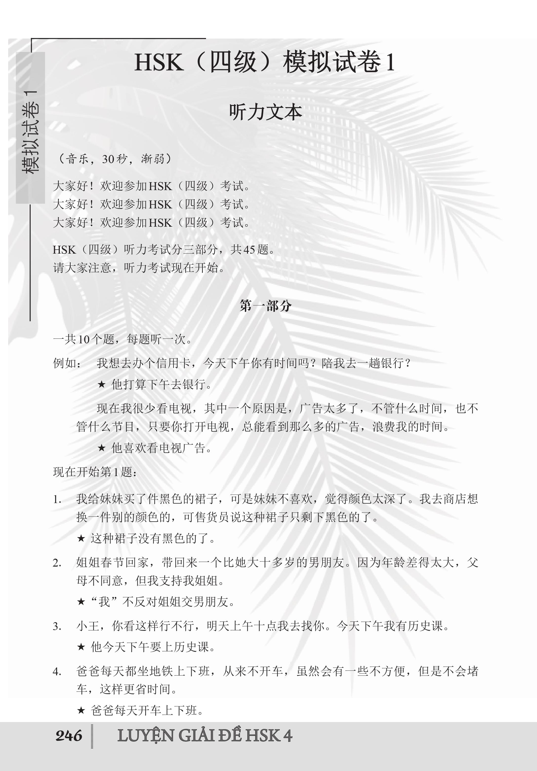 - Phần 3: Thuyết minh đáp án (cung cấp Văn bản ghi âm, Đáp án và Thuyết minh đáp án của 12 đề mô phỏng ở phần 2) Ngoài những đề thi mô phỏng ở phần 2, sách Luyện giải đề HSK cấp 4 còn có hệ thống bài tập thuộc phần 1 (Phần Những kỹ xảo giải đề). Hệ thống bài tập này bao gồm 2 nhóm: nhóm Bài tập kỹ xảo và nhóm Bài tập tính giờ.