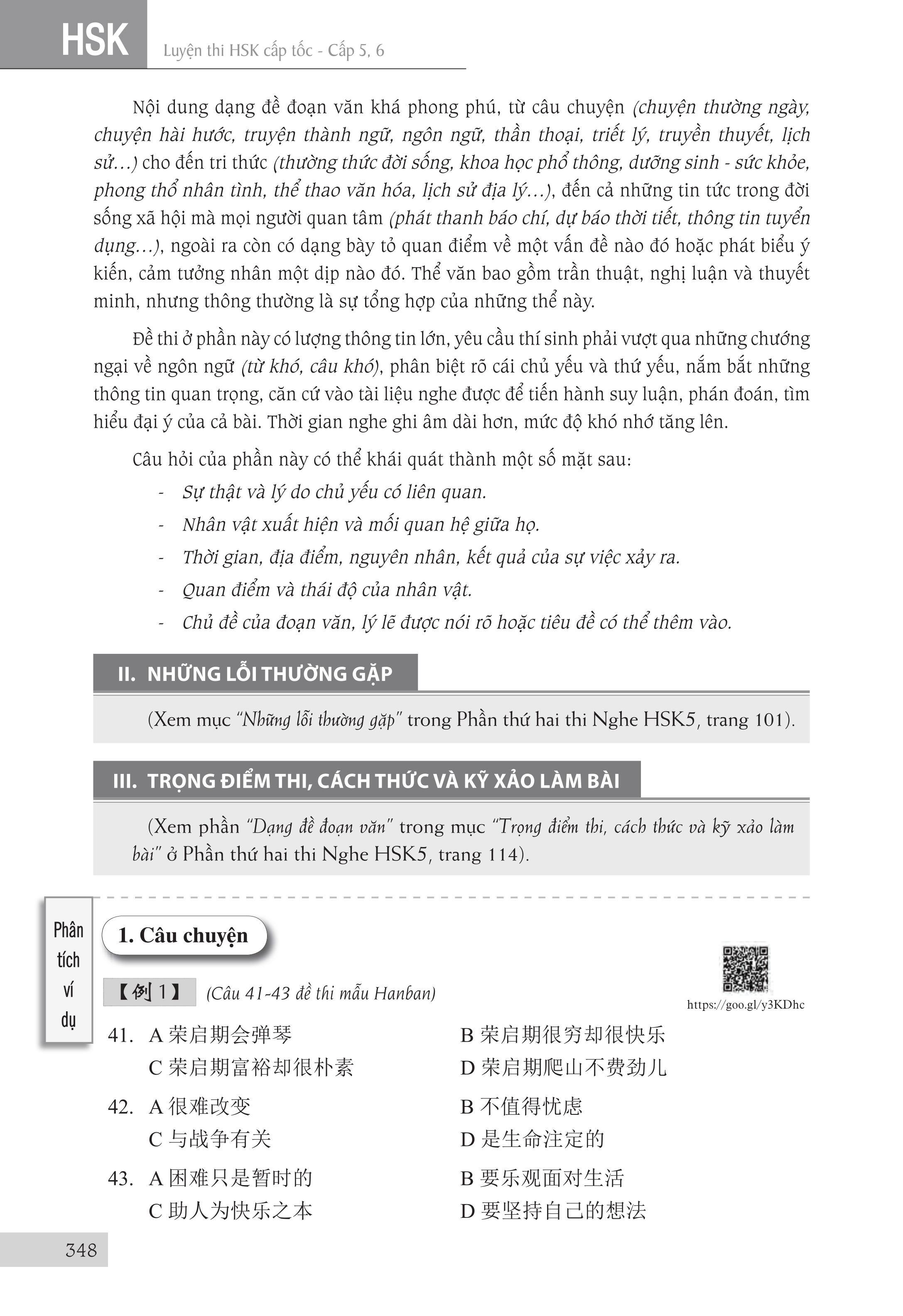 - Luyện thi HSK cấp tốc tập 3 - Cấp 5-6 (kèm CD) Tác giả: Trương Văn GIới & Lê Khắc Kiều Lục Nhà xuất bản Đại Học Quốc Gia TPHCM Số trang: 568 Kích thước: 18.5cm x 26.5cm x 2.7cm Cân nặng: 900g Đầu tiên xin được thuyết minh về chữ “cấp tốc” mà chúng tôi dùng trong tên của bộ sách. “Cấp tốc” không phải theo ý nghĩa đơn giản là nhanh và dễ dàng, không cần phải học nhiều mà cũng có thể thi đậu. Ý nghĩa của từ “Cấp tốc” mà chúng tôi hướng đến khi biên soạn bộ sách này là giúp người học nắm vững toàn bộ kiến thức của kỳ thi của một cách nhanh nhất mà vẫn bảo đảm kết quả tốt nhất. Người học vẫn phải làm việc cật lực để chuẩn bị tốt cho kỳ thi mới hy vọng có được kết quả khả quan. Kỳ thi HSK do Văn phòng Hán ngữ nhà nước Trung Quốc (gọi tắt là HANBAN) tổ chức. HANBAN đã xây dựng chuẩn kiến thức (từ vựng, điểm ngôn ngữ, chủ đề đàm thoại …) cho từng cấp độ, từ đó đưa ra đề thi mẫu tương ứng cho cấp độ thi đó. Như vậy, Đề cương và Đề thi mẫu của HANBAN chính là tài liệu chuẩn để thí sinh ôn luyện, giáo viên và các trường giảng dạy cho kỳ thi HSK. Nó cũng là đề cương để các tác giả, nhà xuất bản và các đơn vị biên soạn và xuất bản các tài liệu cho kỳ thi này. Để đạt mục tiêu “cấp tốc” đã giải thích ở trên, chúng tôi dựa vào Đề cương và Đề thi mẫu của HANBAN, cũng như những tài liệu luyện thi HSK của Trung Quốc để biên soạn bộ sách này. Từng phần của bài thi được giới thiệu qua một cấu trúc thống nhất như sau: I. Đặc điểm dạng đề: Phần này giới thiệu cấu trúc, đặc điểm và cách làm dạng bài thi này. Ở đề thi viết còn giới thiệu cách chấm điểm của dạng đề. Rõ ràng là để làm bài thi tốt, đầu tiên là phải nắm vững đề thi và biết cách làm loại đề thi đó. II. Những lỗi thường gặp: Chúng tôi tổng hợp những lỗi thường gặp của thí sinh khi làm dạng đề thi này. Học tập từ sai lầm là cách cực kỳ hiệu quả để tránh lặp lại những sai lầm của những người đi trước đã gặp phải khi làm bài. III. Trọng điểm thi, cách thức và kỹ xảo làm bài: Đây là phần quan trọng nhất của tài liệu Phần trọng điểm thi giới thiệu những trọng tâm mà dạng đề thi tập trung vào. Liên quan đến trọng điểm thi này, chúng tôi đã hệ thống hóa các điểm ngôn ngữ, công thức hóa các cấu trúc ngữ pháp cũng như tập hợp các từ ngữ có liên quan. Tiếp theo, người học sẽ được giới thiệu về cách thức, kỹ xảo làm bài. Cuối cùng là Mục phân tích ví dụ, Phần này được chúng tôi biên soạn hết sức công phu vì biết rằng những lý thuyết, những phân tích ở phần trọng điểm thi, cách thức kỹ xảo làm bài sẽ rất khó được nắm bắt nếu không có những ví dụ cụ thể. Những ví dụ được sử dụng được lấy từ các đề thi, ưu tiên lấy từ đề thi mẫu của HANBAN, để minh họa cho những vấn đề đã được giới thiệu ở phần trọng điểm thi và cách thức kỹ xảo làm bài.