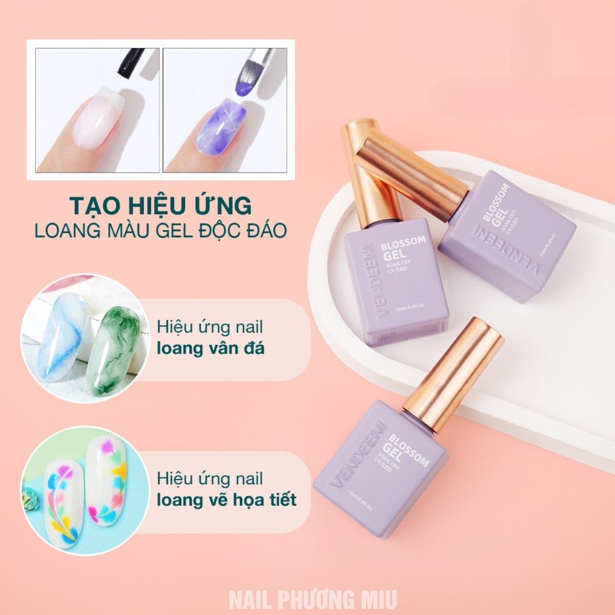 - TOP LOANG VENDEENI – HIỆU ỨNG LOANG MÀU NGHỆ THUẬT Top loang Vendeeni (chai màu tím) là sản phẩm chuyên dụng để tạo hiệu ứng loang màu gel. Với chất gel đặc vừa phải, không quá lỏng cũng không quá sệt, kết hợp cùng màu gel trong suốt, sản phẩm giúp các kỹ thuật viên dễ dàng tạo nên những đường nét vẽ mềm mại, tinh tế và sống động như thật. Top loang không chỉ phù hợp với các thiết kế nghệ thuật, mà còn thích hợp với phong cách đơn giản, sang trọng nhờ khả năng tương thích tốt với mọi màu gel. Dù là tone nude nhẹ nhàng hay tone rực rỡ nổi bật, top loang Vendeeni đều làm nổi bật độ sâu và chiều sâu của màu sắc.