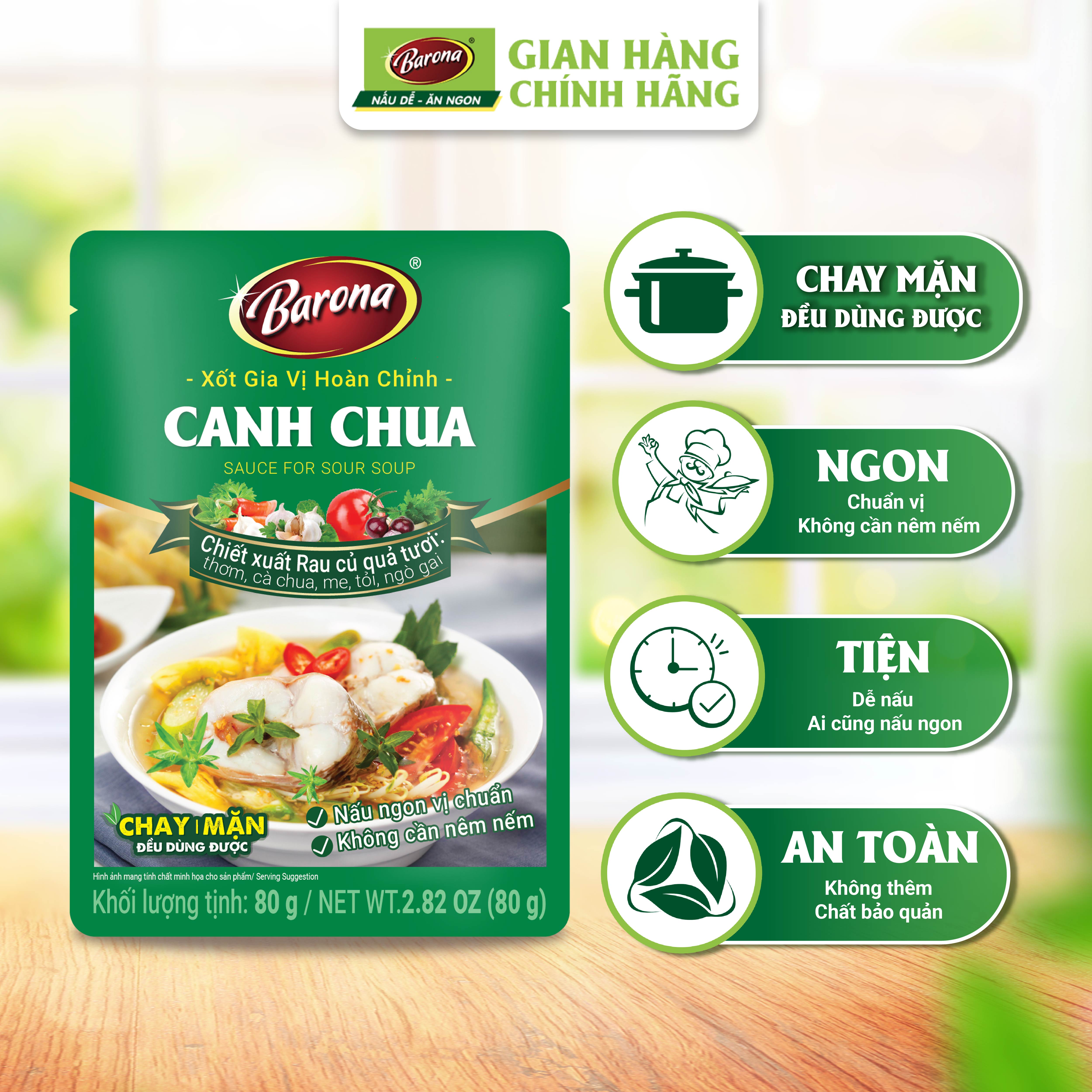 - Chay mặn đều dùng được Xốt Gia Vị Hoàn Chỉnh Barona Canh Chua còn dùng để chế biến món Canh Chua, Lẩu Chua Cay, Canh Chua Măng mà không cần nêm nếm thêm bất kỳ gia vị nào khác. QUY CÁCH: 80g/gói x 20 gói/hộp x 4 hộp/thùng HSD: 15 tháng *HƯỚNG DẪN THỰC HIỆN: Khẩu phần 4-5 người Chuẩn bị: