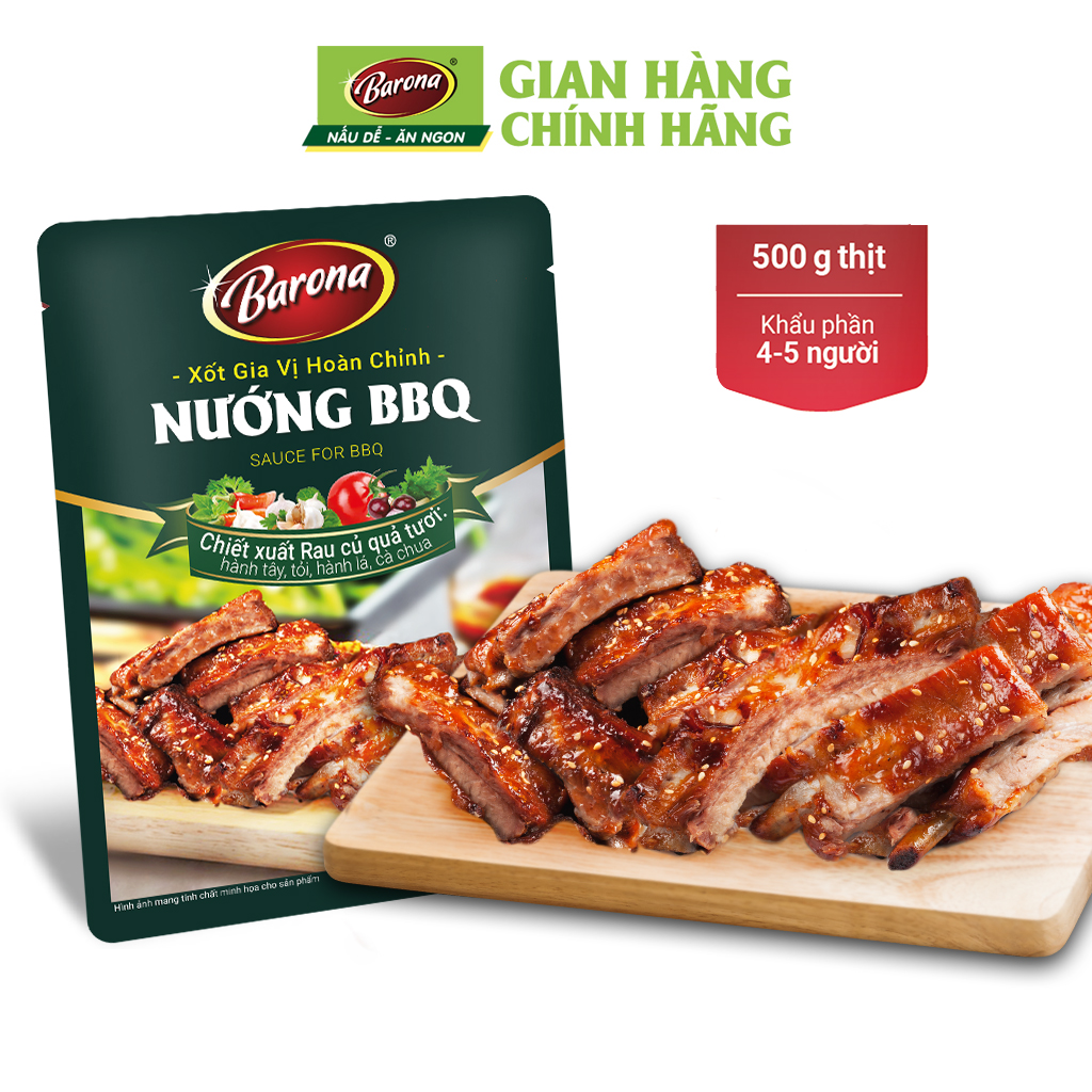 Xốt Gia Vị Hoàn Chỉnh Barona - Nướng BBQ là công thức phối trộn độc đáo giữa chiết xuất rau củ quả tươi như: Hành tây, tỏi, hành lá, cà chua… cùng các loại gia