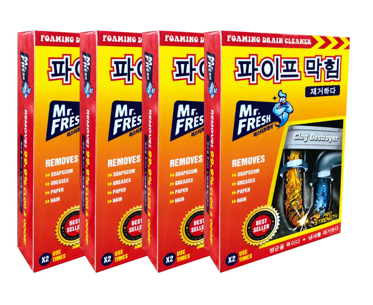Thông Tin Sản Phẩm Tên Sản Phẩm : Hộp bột thông cống Mr Fresh Hàn Quốc 200gCông dụng : Thông tắc ống cống , ống thoát nước.Thành phần : Sodiumhydrochlorite, sdiumhydroxide, sodium silicate, hidrotrope, blodegradeble surfactant 99%Hướng dẫn sử dụng : - Cắt chéo miệng túi, đổ hạt bột vào xô nhựa, hòa tan với khoảng nửa lít nước, đổ dung dịch vào cổ ống nơi bị tắc nghẽnĐể từ 1 – 3 giờ rồi xả mạnh nước cho chảy đi (tốt nhất là đổ buổi tối, để tới sáng hôm sau mới xả mạnh nước hoặc dùng thụt cao su thụt cho chảy đi).Kích thước : 14,6 x 9,7 x 3,2 cmTrọng lượng : 200gHình thức đóng gói : 2 gói 100g/hộpMàu sắc : Hộp Đỏ (gói bên trong màu bạc)Xuất xứ : Mr Fresh - Hàn Quốc Bột thông tắc đường ống thoát nước Mr.Fresh Hàn Quốc là một trong những sản phẩm tốt nhất được bán chạy ở Hàn Quốc với công thức tiên tiến, các thành phần hóa học chuyên dụng, độ tẩy cực mạnh sẽ xoáy tan mọi cặn bẩn trong đường ống một cách hiệu quả.Sản phẩm sẽ thông sạch mọi loại cặn bẩn như giấy, rác, rau, mỡ, thịt, gạo, tóc… kẹt trong đường ống thoát nước của chậu rửa nhà bếp, lavabo, bồn tắm… mà không làm hư hại đường ống và các thiết bị vệ sinh.Bột thông tắc đường ống thoát nước Mr.Fresh Hàn Quốc trong thành phần của nó luôn có các hỗn hợp hóa học có độ kiềm, độ ăn mòn, độ phân hủy cực cao, giúp phân hủy các hợp chất hữu cơ, chất cặn bã có trong đường ống gây tắc nghẽn. ƯU ĐIỂM NỔI BẬT CỦA BỘT THÔNG TẮC VỆ SINH THÔNG CỐNG HÀN QUỐC MR.FRESH : – Sử dụng dễ dàng– Xóa bỏ sự lo lắng tắc đường ống cống, tắc bể phốt.– Nhanh chóng và tiện lợi cho việc chăm sóc gia đình.– Phân hủy và làm mềm các chất hữu cơ gây tác nghẽn đường ống như: rêu, rác, thức ăn thừa, mỡ, cọng rau, tóc và các xác động vật– Công thức tẩy sạch vết bẩn cứng đầu nhanh chóng– Không để lại mùi khó chịu như các sản phẩm thông thường– Giúp bồn cầu và ống dẫn nước thải luôn sạch sẽ, vệ sinh HƯỚNG DẪN CÁCH SỬ DỤNG Bột thông tắc đường ống thoát nước Mr.Fresh Hàn Quốc Cắt chéo miệng túi, đổ hạt bột vào xô nhựa, hòa tan với khoảng nửa lít nước, đổ dung dịch vào cổ ống nơi bị tắc nghẽnĐể từ 1 – 3 giờ rồi xả mạnh nước cho chảy đi (tốt nhất là đổ buổi tối, để tới sáng hôm sau mới xả mạnh nước hoặc dùng thụt cao su thụt cho chảy đi)Bột thông tắc đường ống thoát nước Mr.Fresh Hàn Quốc đã và đang được sử dụng nhiều ở những đơn vị lớn như khách sạn , nhà hàng..