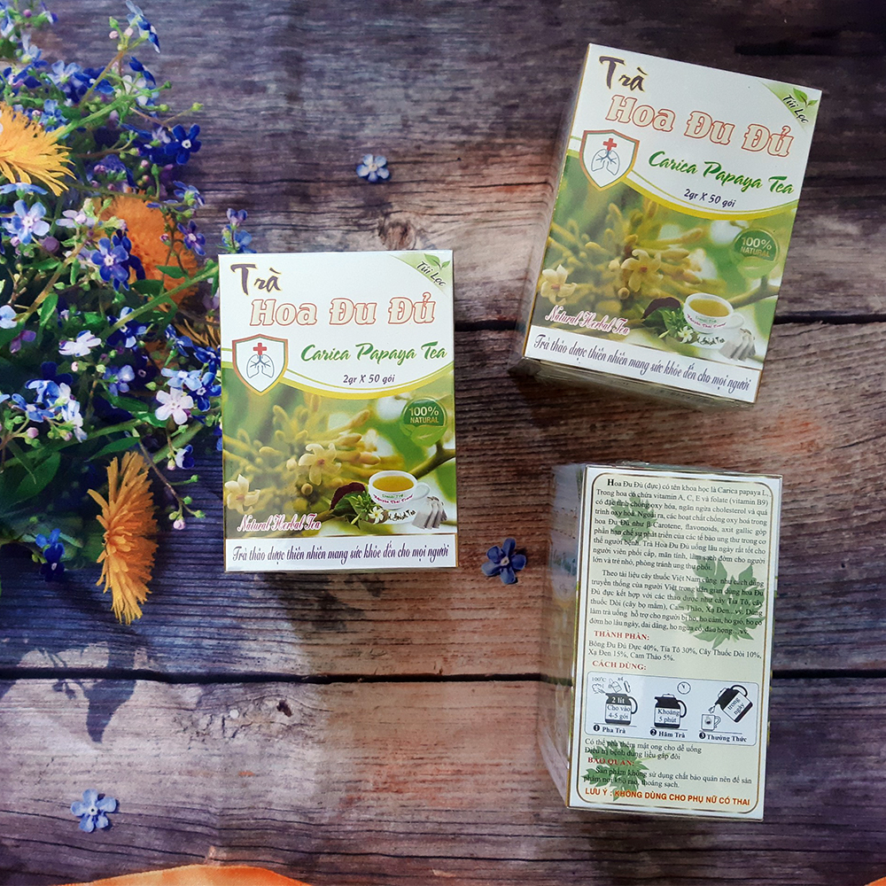 Hoa Đu Đủ (đực) có tên khoa học là Carica papaya L, Trong hoa có chứa vitamin A, C, E và folate (vitamin B9) có đặc tính chống oxy hóa, ngăn ngừa cholesterol và quá trình oxy hoá. Ngoài ra, các hoạt chất chống oxy hoá trong hoa đu đủ như β-Carotene, flavonoids, axit gallic góp phần hạn chế sự phát triển của các tế bào ung thư trong cơ thể người bệnh. Trà Hoa Đu Đủ uống lâu ngày rất tốt cho người viên phổi cấp, mãn tính, làm sạch đờm cho người lớn và trẻ nhỏ, phòng tránh ung thư phổi.