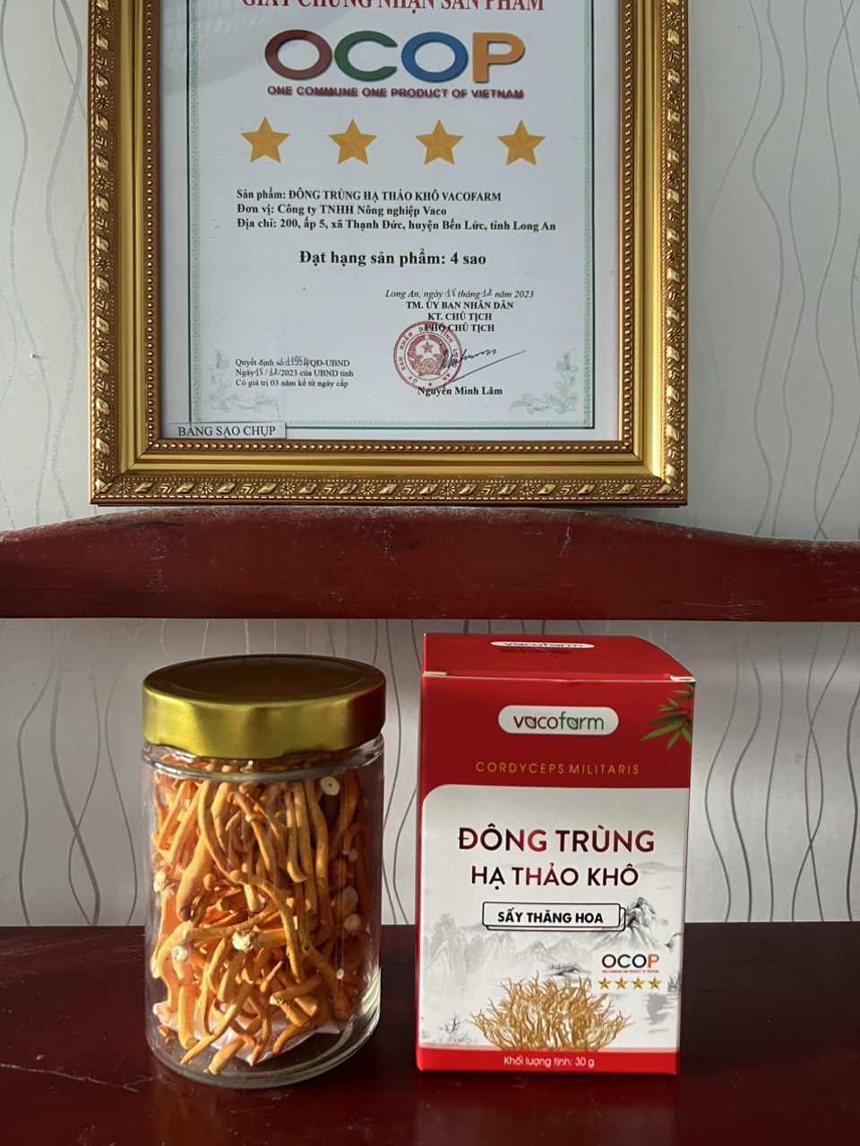 Nấm Đông Trùng Hạ Thảo Nguyên Sợi Sấy Khô bằng phương pháp sấy Thăng Hoa Vacofarm lọ 30g siêu tiện lợi bằng thủy tinh. Đông Trùng Hạ Thảo khô là Đông trùng hạ thảo chủng Cordyceps Militaris đạt chất lượng cao và ứng dụng phương pháp sấy thăng hoa (-49oC), giúp giữ nguyên  hàm lượng dược chất, sản phẩm được đóng gói quy cách hộp 10g, 30g, 50g đựng trong hộp giấy. sản phẩm thích hợp sử dụng hằng ngày, tiện lợi cho người sử dụng. Lượng dùng: Đối với người bình thường muốn duy trì sức khỏe và phòng  bện: dùng ngày một lần vào buổi sang (có thể dùng trước hoặc sau khi ăn, hấp thu tốt là trước lúc ăn). Lượng dùng 1g/lần Đối với người ố. m, suy nhược cơ thể, người các bệnh mạng tính dùng ngày 2-3 lần, lượng dùng 1g/lần Có thể dùng chung chưng cùng tổ yến, táo đỏ, kỷ tử, tần gà, hoặc ngâm cùng các vị thuốc bắc để bồi bổ và tăng cường sức khỏe. Bảo quản: trong ngăn mát tủ lạnh sau khi mở nắp. Hsd: 18 Tháng Xuất xứ: Việt Nam Sản phẩm của công ty TNHH Nông Nghiệp VaCo, đạt chứng nhận OCOOP 4 sao.
