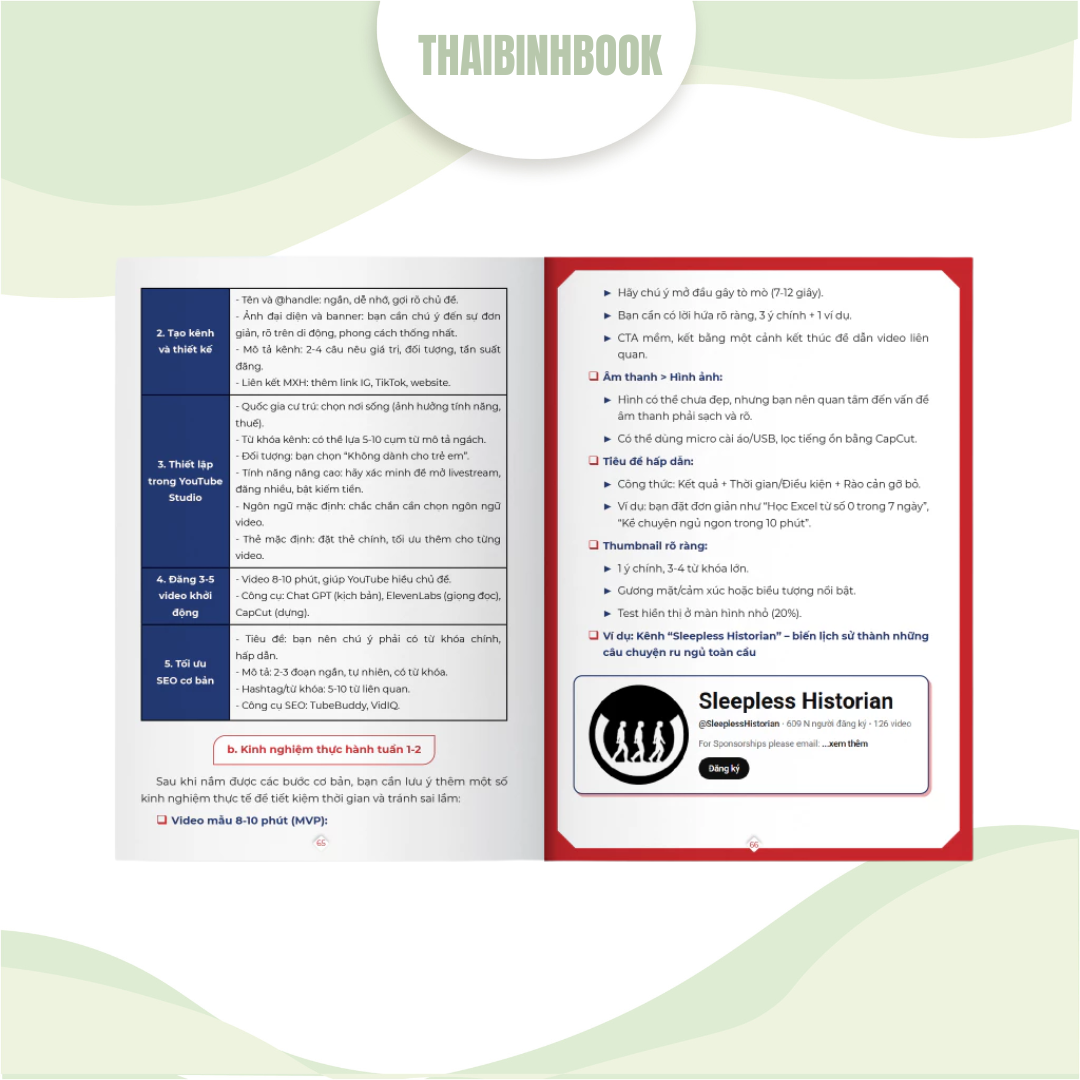 - Nội dung chính: Sách cung cấp một lộ trình thực chiến từ A đến Z để bạn xây dựng và phát triển kênh. Nội dung bao gồm các chiến lược từ việc chọn ngách, viết kịch bản, sản xuất video không cần lộ mặt, đến các công cụ tối ưu SEO, tiêu đề, và thumbnail. Sách còn chia sẻ kinh nghiệm 90 ngày để kiếm được $1,000 đầu tiên và phân tích các mô hình kênh thành công thực tế để bạn có thể áp dụng.