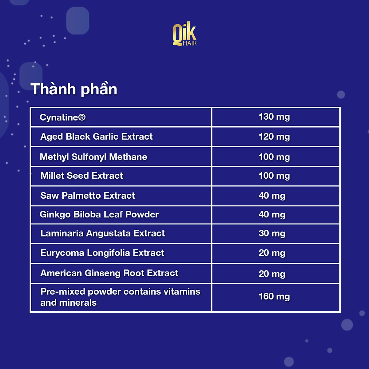 - CÔNG DỤNG Qik (For Men) với công thức chuyên biệt cho nam giới, chứa các tinh chất thiên nhiên, giúp hỗ trợ cân bằng hệ thần kinh nội tiết và tăng trưởng tế bào mầm tóc: