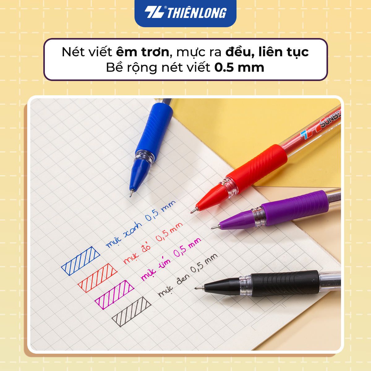 Thông số kĩ thuật : Tên danh mục Bút Gel Thương hiệu Thiên Long Đường kính viên bi 0.5 mm Màu mực Đen / đỏ / tím / xanh Trọng lượng 10 gram Tính năng