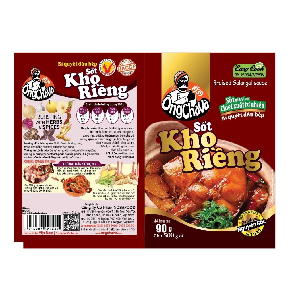 Sốt Kho riềng Ông Chà Và 90g là loại sốt sệt, sánh, đã chứa đủ gia vị, tiện lợi, chỉ cần bóc ra ướp với thịt và chế biến các món kho. Giữ trọn vị cay thơm, mang đến sự tiện lợi cho người đứng bếp cùng món thịt thơm ngon đặc trưng cho mỗi bữa cơm gia đình người Việt.   1. THÔNG TIN SẢN PHẨM - Thương hiệu: Ông Chà Và. - Trọng lượng: 90gr. - Số lượng: 15 Túi. - Thành phần: Nước mắm, đường, hành, tỏi,.. - HSD: 12 tháng kể từ ngày sản xuất. - Nhà sản xuất: Công ty cổ phần Nosafood. - Địa chỉ sản xuất: Lô D3/1-4 Đường VL7, KCN Vĩnh Lộc 2, xã Long Hiệp, huyện Bến Lức, tỉnh Long An.   2. MỘT SỐ MÓN ĂN GỢI Ý Dùng để ướp thịt và chế biến các món kho riềng. - Hướng dẫn sử dụng: + Bước 1: Ướp 1 gói Sốt Kho Riềng Ông Chà Và 90g với 500g thịt cá đã làm sạch trong 20 phút. + Bước 2: Cho 2 muỗng dầu ăn vào nồi, làm nóng dầu, phi cùng hành tỏi. Cho cá vào kho cho đến khi săn và thấm gia vị. + Bước 3: Cho 200ml nước sôi vào đun, giảm lửa nhỏ cho đến khi nước sệt lại. Tắt lửa cho thêm hành lá và tiêu. + Bước 4: Gắp ra đĩa và thưởng thức cùng cơm nóng.   3. HƯỚNG DẪN BẢO QUẢN - Để nơi thoáng mát, tránh tiếp xúc ánh nắng mặt trời. - Sau khi mở bao bì, gói kín, bảo quản trong ngăn mát tủ lạnh.   4. CAM KẾT TỪ SHOP - Sản phẩm đạt tiêu chuẩn ISO 22000, HACCP và đảm bảo An toàn vệ sinh thực phẩm. - Cam kết hàng rõ nguồn gốc, xuất xứ, đền tiền gấp đối nếu phát hiện hàng giả, hàng không đúng thương hiệu, quá hạn sử dụng khi khách hàng nhận đơn hàng. - Nếu giao sai/thiếu sản phẩm, Shop chịu trách nhiệm 100%. Trừ trường hợp sản phẩm bị móp méo về ngoại quan vì đây là do vấn đề khách quan từ nhiều yếu tố như vận chuyển, bảo quản hàng hóa từ kho.   #ongchava #giavi #giavipho #giaviphobo #viengiavi #sotuopthitnuong #sate #satetom #satesodiep #satebaongu #botgiavi #suahat #suahathanquoc #tuongden #cariga #tuongot #botcari #nguvihuong