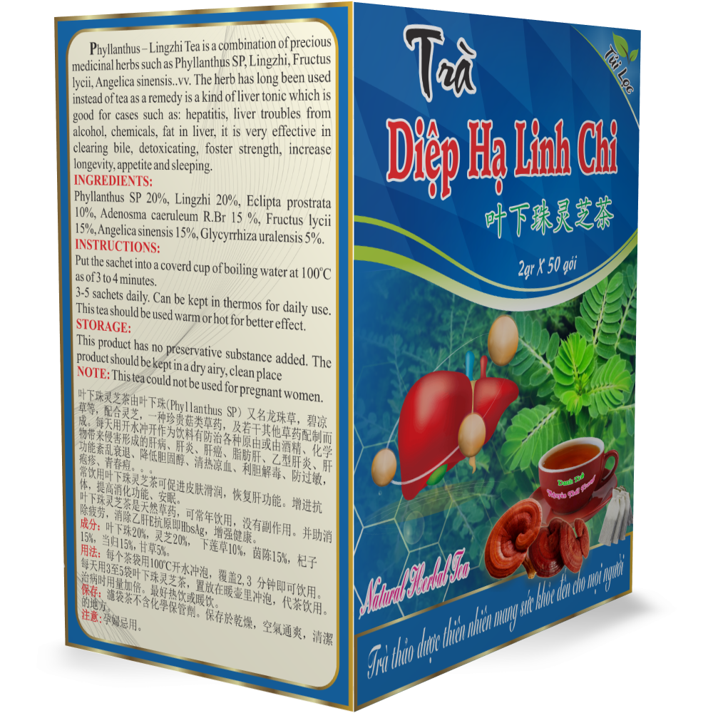 TRÀ DIỆP HẠ LINH CHI      Trà được chế biến từ cây Diệp Hạ Châu “phyllanthus SP”, dân gian ta còn gọi là “CHÓ ĐẺ RĂNG CƯA” được kết hợp với nấm Linh Chi là một thảo dược quý rất tốt cho sức khỏe, cùng với các thảo dược thiên nhiên khác làm thành trà, thay nước uống hằng ngày hỗ trợ và rất tốt cho người bị viên gan, viên gan siêu vi B, viên gan mãn tính, viên gan cấp, rối loạn chức năng gan do rượu – hóa chất, hạ cholesterol – gan nhiễm mỡ, mỡ trong máu, thông mật giải độc, thanh nhiệt, chống dị ứng, mụn nhọt …vv.     Diệp Hạ Linh Chi là trà thảo dược thiên nhiên uống lâu không có tác hại phụ, giúp cho da dẻ mịn màng bảo vệ và khôi phục chức năng gan, tăng cường bổ máu vào tạng gan, phục hồi cơ thể, tăng cường đề kháng, phòng chống ung thư, ăn ngủ ngon. Ngoài ra còn giúp thanh lọc cơ thể, chống  mệt mỏi, tăng cường sức khỏe làm sạch HbsAg.        THÀNH PHẦN: Diệp Hạ Châu 20%, Linh Chi 20%, Hạn Liên Thảo 10%, Nhân Trần 15%, Kỷ Tử    15%, Đương Quy 15%, Cam Thảo 5%. CÁCH DÙNG: Cho túi trà vào tách nước sôi 100oC đậy kín khoảng 3-4 phút là dùng được. Ngày uống từ 4 đến 6 gói có thể cho trực tiếp vào bình thủy uống trong ngày  ( loại trà này nên dùng khi nước trà còn nóng hoặc ấm thì tốt hơn). BẢO QUẢN: Vì không sử dụng hóa chất bảo quản nên để hộp trà nơi khô ráo, thoáng sạch. SẢN XUẤT TẠI: DNTT Trà Thảo Dược Nguyên Thái Trang 01 Phan Đình Phùng, Phường 1, Tp. Đà Lạt, Lâm Đồng HẠN SỬ DỤNG: