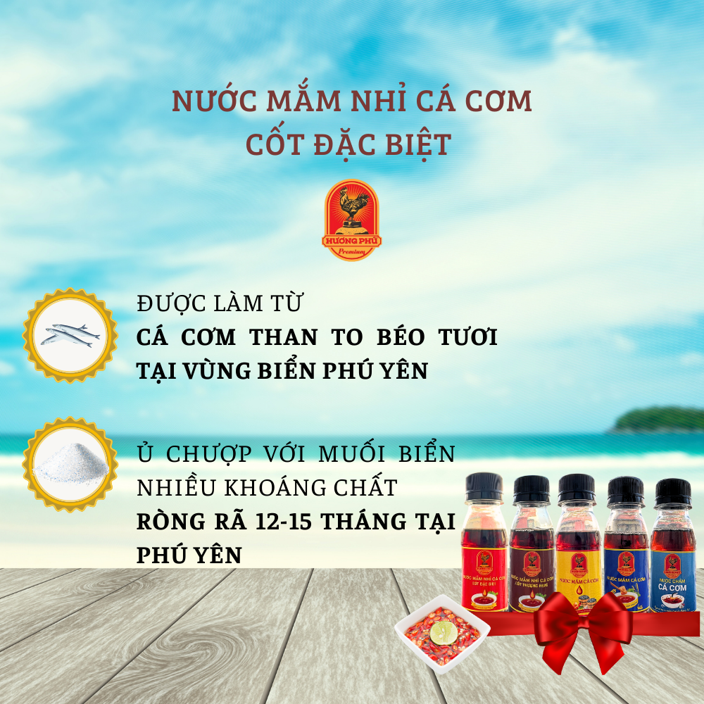 Với 100% cá cơm tươi, béo ú được chọn lựa kỹ được kết hợp với muối tinh khuyết được ủ bằng phương pháp truyền thống trong thùng gỗ được lên men tự nhiên, sau 18 đến 24 tháng những dòng nước cốt nguyên chất, không pha được rút, nhỉ ra từng giọt mắm màu cánh gián đẹp mắt, đậm đà, hậu vị được đóng chai tạo nên Nước mắm nhỉ cá cơm cốt đặc biệt HƯƠNG PHÚ 40 - 30- 20-12-7 độ đạm.
