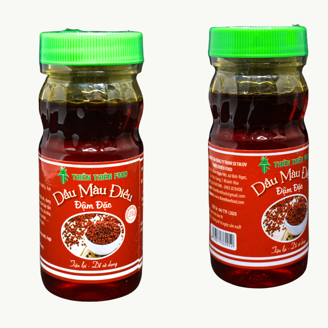 Màu dầu điều là gia vị chế biến dạng nước dùng tạo màu đẹp cho các món ăn, giúp cho món ăn có màu sắc hấp dẫn hơn mà không thay đổi vị ban đầu,
