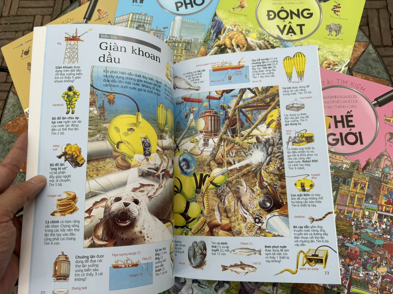 Từ bạch tuộc khổng lồ và cá mập trắng đến những thợ lặn biển sâu và kho báu dưới biển, trong các trang của cuốn sách tranh tuyệt đẹp này có nhiều thứ để em tìm kiếm. Thử tài tìm kiếm – Biển khơi chứa đựng vô vàn thông tin thú vị về thế giới trong lòng biển, từ rạn san hô kì diệu đến đáy đại dương sâu thẳm.