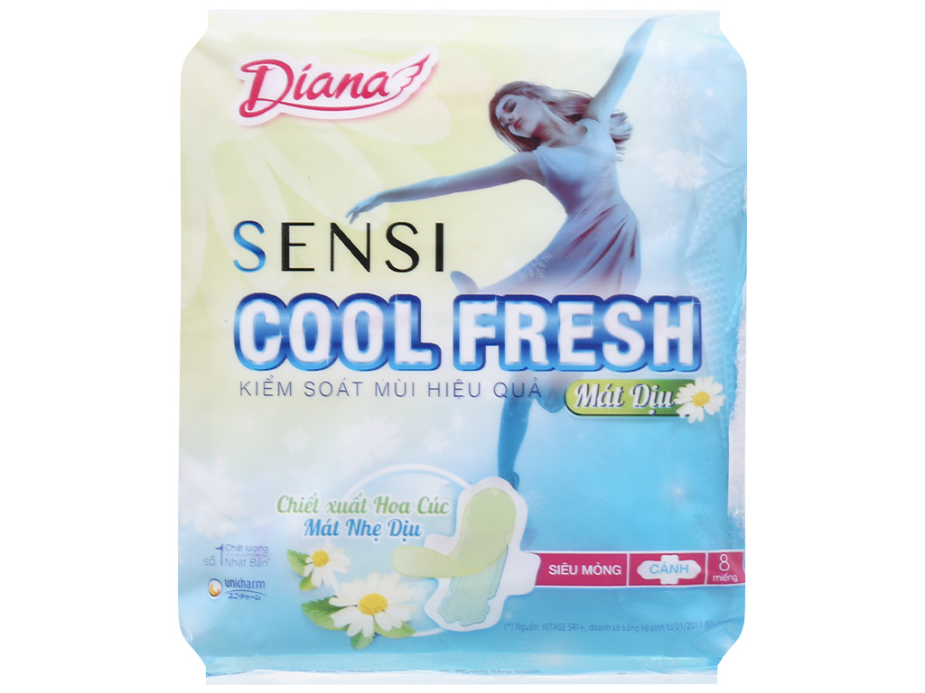 Băng vệ sinh Diana Sensi Cool Fresh Mát Dịu Siêu Mỏng Cánh 8 miếng - Chiết xuất hoa cúc la mã <> mang đến cảm giác mát nhẹ dịu và kiểm soát mùi hiệu quả
