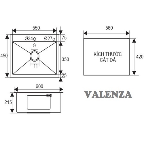 ✨Combo chậu rửa bát 1 hố sus304 Valenza 6045, vòi rửa bát vuông tròn Valenza, xả, rổ, bình xà phòng