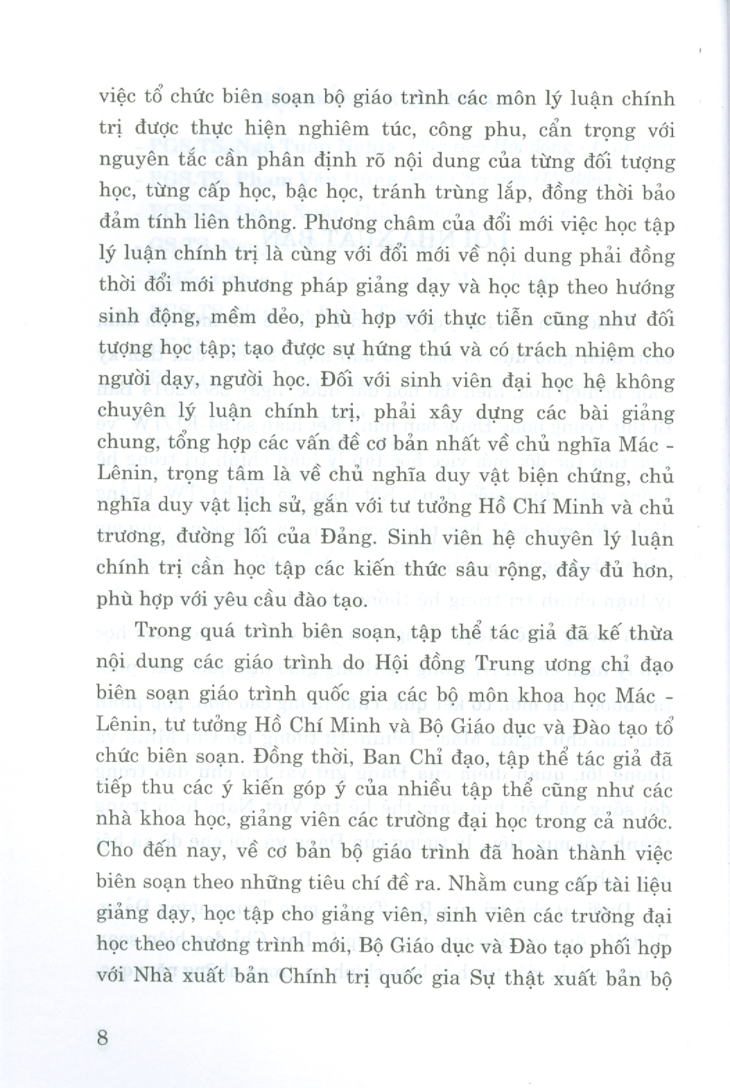 Bộ giáo trình được biên soạn theo tinh thần đổi mới cả về nội dung và phương pháp giảng dạy, tiếp cận với những phương pháp giáo dục mới, cập nhật những nghiên cứu, kiến thức lý luận chính trị mới, chú trọng liên hệ với thực tiễn công cuộc đổi mới, phát triển đất nước.