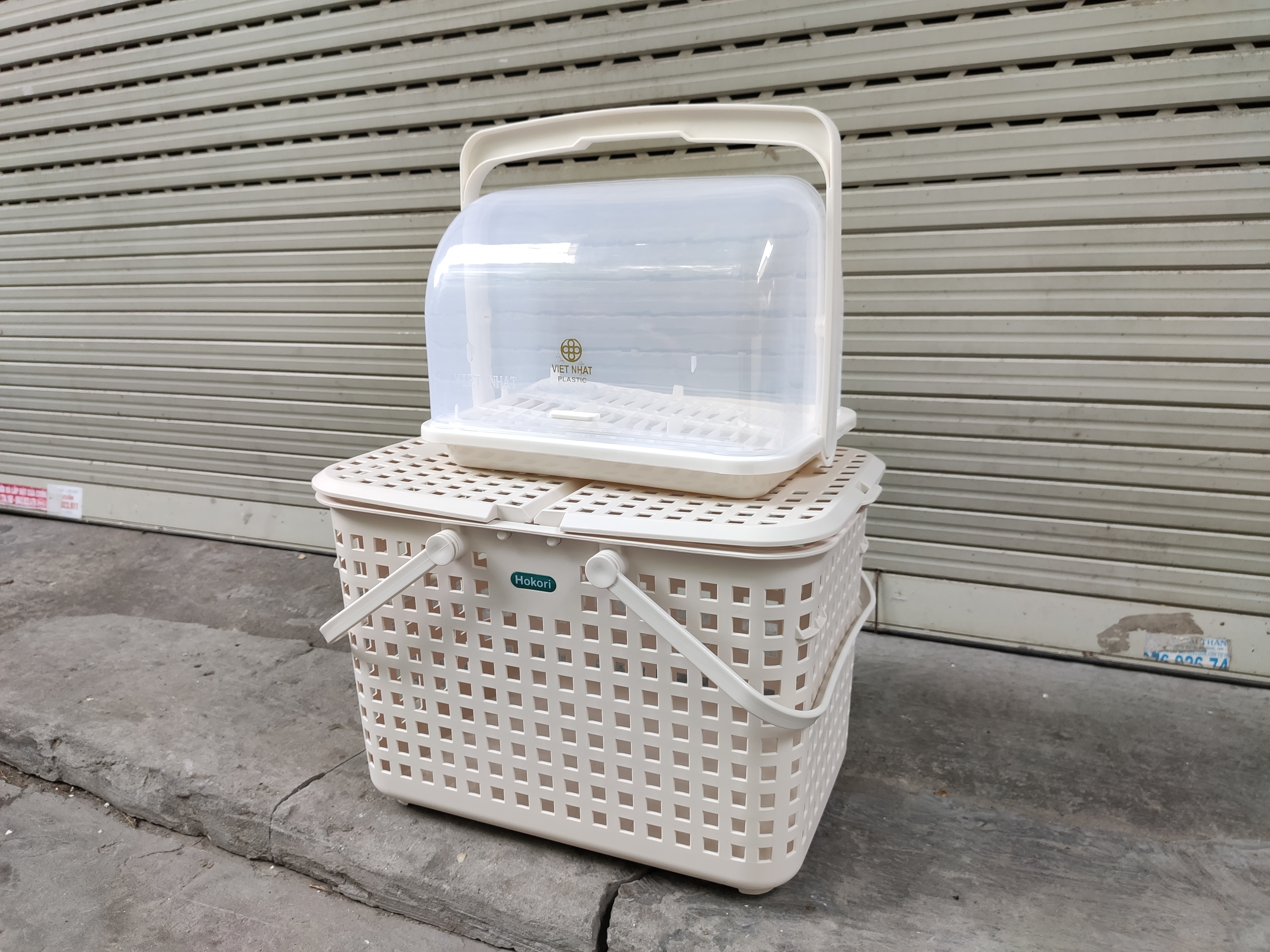 Combo kệ úp bình sữa và Giỏ đựng đồ cho mẹ đi sinh bằng nhựa cao cấp quai giữa có nắp đậy HOKORI - Nhiều Màu (tặng bộ chổi vệ sinh có nam châm hít từ )Kệ úp sữa ,Giỏ xách quai giữa có nắp HOKORI có 3...