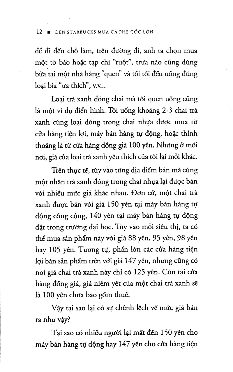 Hầu như người đọc sẽ hiểu nhầm về lý do Mặt bằng. Ví dụ tách cafe ở vỉa hè giá chỉ 10.000đ nhưng ở quán cafe sang chảnh có giá từ 25.000đ trở lên. Còn vào Starbucks hay Highlands…thì giá có thể lên tới 50-60.000đ. Bài toán thương hiệu khiến cho Starbucks bán chạy dù giá cắt cổ, hoặc bài toán về chi phí mặt bằng thì vô cùng dễ hiểu. Nhưng ở đây tác giả lấy ví dụ về những trường hợp mà siêu thị, cửa hàng tiện lợi hoặc tiệm tạp hoá cùng bán những chai nước lọc cùng nhãn mác thì sẽ như thế nào? Bạn đọc có trả lời được đúng đắn như tác giả đề cập hay không?