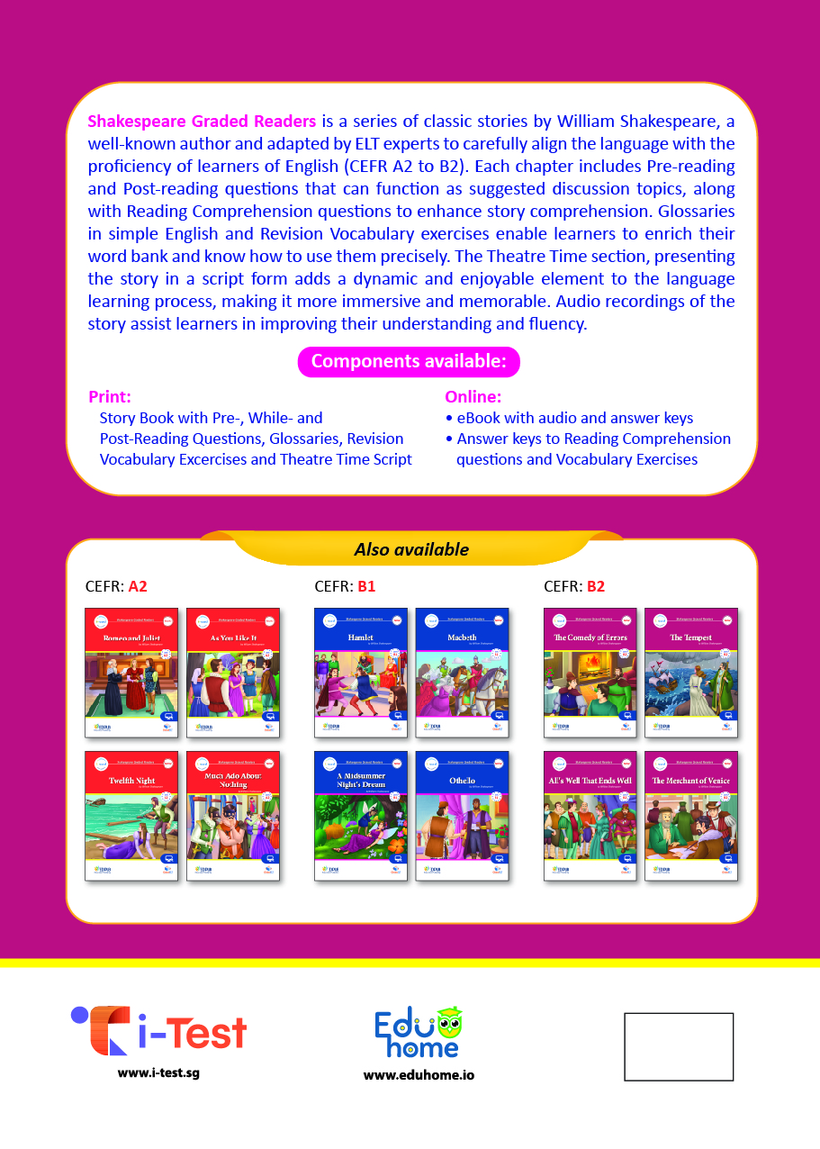 Shakespeare Graded Readers is a series of classic stories by William Shakespeare, a well-known author and adapted by ELT experts to carefully align the language with the proficiency of learners of English (CEFR A2 to