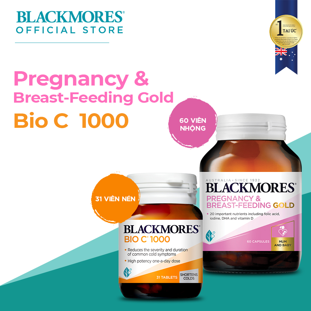 BỘ SẢN PHẨM BAO GỒM: 01 x Vitamin Tổng Hợp Cho Bà Bầu và Mẹ Cho Con Bú Blackmores Pregnancy & Breast-Feeding Gold Lọ 60 Viên 01 x Viên Uống Bổ Sung Vitamin C Blackmores Bio C 1000mg Lọ 31 Viên   THÔNG TIN CHI TIẾT 1. Vitamin Tổng Hợp Cho Bà Bầu và Mẹ Cho Con Bú Blackmores Pregnancy & Breast-Feeding Gold Sản phẩm được điều chế để hỗ trợ thai kỳ khỏe mạnh hơn cho cả mẹ và bé. Chứa 20 chất dinh dưỡng được thiết kế riêng bao gồm axit folic, sắt, DHA và vitamin D, cung cấp liều lượng lý tưởng cho mẹ và hỗ trợ cho bé phát triển khỏe mạnh. Cùng với đó là omega-3 DHA có lợi sự phát triển não bộ và hệ thần kinh của bé, bao gồm sắt giúp giảm táo bón, hỗ trợ cho hệ tiêu hóa.   Thành phần • Omega-3 triglyceride cô đặc 250mg • Calcium carbonate 150mg • Magnesium oxide heavy 58,1 mg • Acid Ascorbic 30mg • Sắt glycinate 19,22mg • Nicotinamide 9mg • Kẽm oxide 6,82 mg • D-alpha-tocopherol 3,5mg • Calcium pantothenate 2,73 mg • Betacaroten 2,4 mg   Công dụng: • Blackmores Pregnancy & Breast-Feeding Gold cung cấp đến 20 chất dinh dưỡng thiết yếu trong một liều dùng hàng ngày: • 500mg axit folic, nếu uống hàng ngày trong một tháng trước khi thụ thai và trong khi mang thai, có thể làm giảm nguy cơ sinh con bị tật nứt đốt sống / dị tật ống thần kinh. • 150mg i-ốt giúp hỗ trợ sự phát triển trí não của bé • Giảm táo bón do sắt. • Dầu cá cô đặc, không mùi, giàu DHA tốt cho sự phát triển trí não và hệ thần kinh của bé.   Sự khác biệt của Blackmores Tất cả các chất dinh dưỡng đều quan trọng trong thời kỳ mang thai và cho con bú. Sau đây, chúng tôi cung cấp thêm một vài thông tin dinh dưỡng thiết yếu trong thời kỳ mang thai và cho con bú có trong Pregnancy & Breastfeeding Gold.   • Axit folic - Theo hướng dẫn tại Úc* sản phẩm chứa 500mg axit folic, vì phụ nữ trong độ tuổi sinh sản nên uống 400-500 μg axit folic mỗi ngày trong ít nhất một tháng trước khi mang thai và trong 3 tháng đầu. của thai kỳ. * Hướng dẫn các hoạt động phòng ngừa trong thực tế, ấn bản thứ 8. Đông Melbourne: Trường Cao đẳng Bác sĩ Đa khoa Hoàng gia Úc, 2012.   • Iốt - Nhu cầu về iốt tăng lên trong toàn bộ thai kỳ, đặc biệt là 20 tuần đầu.
