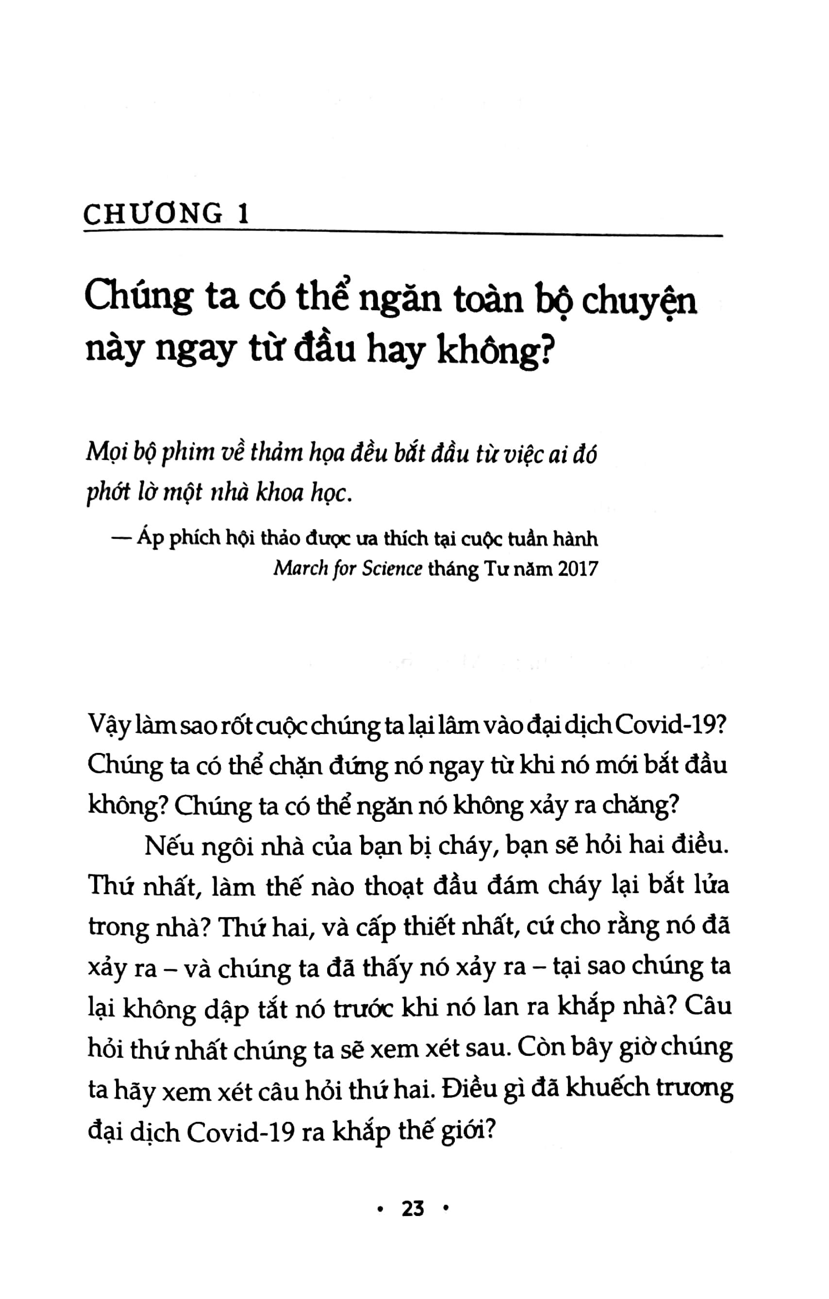 Cuốn sách cũng mô tả một cách gay cấn sự xuất hiện và lây lan của COVID-19, phân tích các bước mà lẽ ra chính phủ các nước có thể hành động để ngăn chặn dịch bệnh.