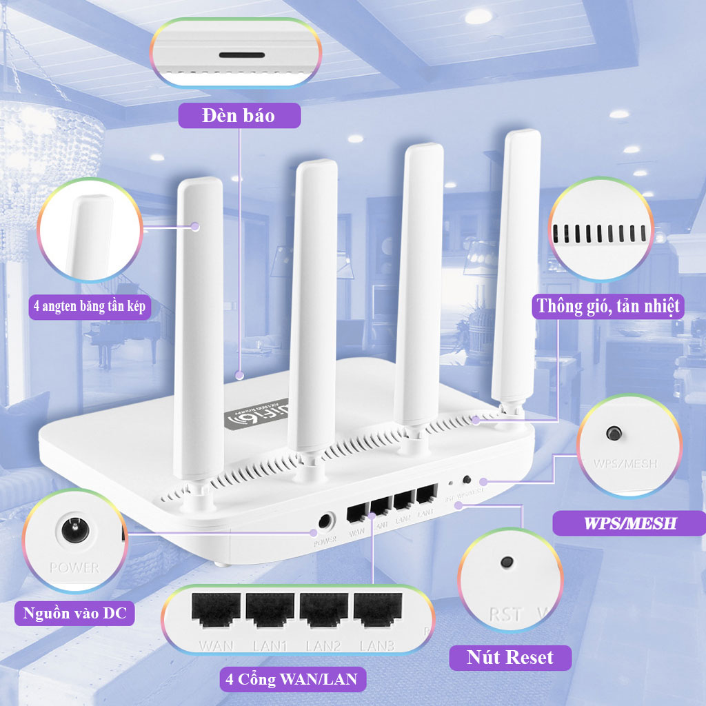 MÔ TẢ SẢN PHẨM – WiFi chuẩn 802.11ac wave2 – 1 WAN và 3 LAN Gigabit – Hỗ trợ 64 thiết bị kết nối đồng thời – 6 ăng-ten Ngoài cho tín hiệu wifi mạnh