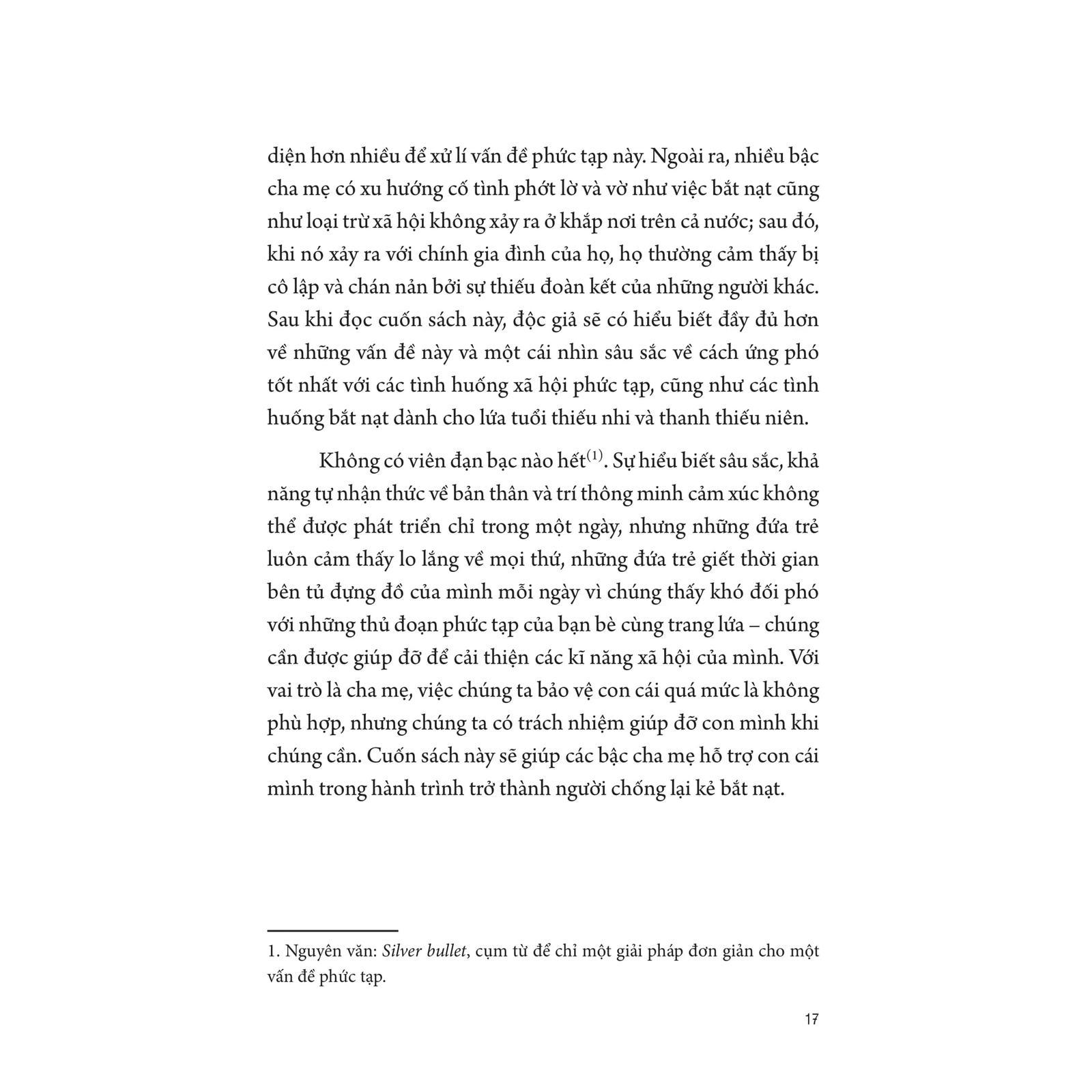 Cuốn sách Cùng Con Chống Nạn Bắt Nạn - Các công cụ thiết thực để bảo vệ và xây dựng sự mạnh mẽ cho con bạn. Cuốn sách khám phá thế giới đen tối của nạn bắt nạt, tất cả các lí do tại sao mọi người lại đi bắt nạt, tại sao một số cá tính lại cố gắng áp đạt quyền lực với bạn bè, tại sao một số người thường trở thành mục tiêu nhiều hơn những người khác và tại sao những người ngoài cuộc không can thiệp. Từ đó, tác giả đưa ra những phương pháp tiếp cận khác nhau để cha mẹ bảo vệ con, giúp con phục hồi sau trải nghiệm bị bắt nạt, đồng thời xây dựng sự tự tin, kiên cường và mạnh mẽ ở con.