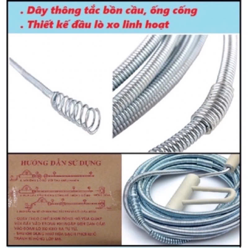 Dây Lò Xo Thông Tắc Cống, Nhà Vệ Sinh 5m 10m – Xử Lý Nghẽn Do Dầu Mỡ, Cơm Thừa Hiệu Quả    LƯU Ý : SHOP CÓ PHÂN LOẠI CUỘN 5 MÉT VÀ CUỘN 10 MÉT , QUÝ KHÁCH VUI LÒNG BẤM CHỌN ĐÚNG PHÂN LOẠI CẦN MUA TRÁNH NHẦM LẪN Ạ Giới Thiệu Sản Phẩm Dây lò xo thông tắc cống, nhà vệ sinh là giải pháp hiệu quả giúp bạn xử lý nhanh chóng tình trạng tắc nghẽn do dầu mỡ, cơm thừa, tóc rối và các chất thải khác. Với thiết kế lò xo linh hoạt, dễ dàng luồn sâu vào đường ống, sản phẩm giúp thông tắc cống thoát nước mà không cần gọi thợ chuyên nghiệp. Đặc Điểm Nổi Bật  Chất liệu cao cấp, chống han rỉ: Được làm từ thép không gỉ bền bỉ, không bị ăn mòn ngay cả khi sử dụng lâu dài trong môi trường ẩm ướt.  Chiều dài linh hoạt: Có hai loại 5m và 10m, phù hợp với nhiều kích thước ống thoát nước khác nhau.  Cơ chế lò xo đàn hồi: Giúp dễ dàng luồn sâu vào bên trong đường ống, làm sạch hiệu quả mọi chất bẩn bám dính.  Tay cầm tiện lợi: Thiết kế cầm nắm chắc chắn, dễ xoay và đẩy lò xo vào sâu hơn.  Không cần hóa chất độc hại: An toàn cho người sử dụng, bảo vệ đường ống và môi trường. Công Dụng Sản Phẩm  Thông tắc cống bồn rửa bát, nhà vệ sinh, chậu rửa mặt, ống thoát nước.  Loại bỏ dầu mỡ, rác thải, tóc rối, cặn bẩn tích tụ lâu ngày.  Phù hợp cho hộ gia đình, quán ăn, nhà hàng, khách sạn. Cách Sử Dụng Dây Lò Xo Thông Tắc Cống