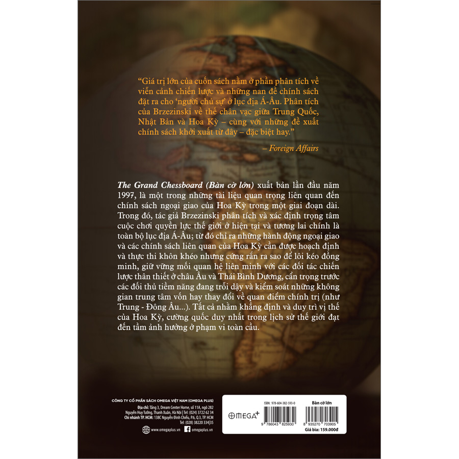 Bàn Cờ Lớn “Bàn cờ lớn” thể hiện tầm nhìn địa chiến lược táo bạo và khiêu khích của Brzezinski dành cho sự ưu việt của nước Mỹ trong thế kỷ 21. Điểm trọng tâm trong phân tích của ông là việc thực thi quyền lực trên lục địa Á-Âu, nơi tập trung phần lớn dân số, tài nguyên thiên nhiên và hoạt động kinh tế của toàn cầu. Trải dài từ Bồ Đào Nha đến Eo biển Bering, từ Lapland đến Malaysia, lục địa Á-Âu chính là một bàn cờ vĩ đại, nơi mà quyền lực tối cao của nước Mỹ sẽ được phê chuẩn và thách thức trong một tầm nhìn dài hạn của những năm sau này. Từ đó, nhiệm vụ mà nước Mỹ phải đối mặt là hiểu về những thay đổi địa chính trị mới trong khu vực này, nhằm đề phòng những đối thủ cạnh tranh mới, quản lý các cuộc xung đột và mối quan hệ ở châu Âu, châu Á và Trung Đông sau sự sụp đổ của Liên Xô để không có siêu cường đối thủ nào phát sinh có thể đe dọa lợi ích sống còn, sự thịnh vượng hay sức mạnh toàn cầu dành riêng cho nước Mỹ. Tại sao Pháp và Đức sẽ đóng vai trò địa chiến lược quan trọng, trong khi Anh và Nhật Bản thì không? Tại sao việc mở rộng NATO mang lại cho Nga cơ hội để xóa bỏ những sai lầm trong quá khứ và tại sao Nga không thể bỏ qua cơ hội này sang một bên? Tại sao số phận của Ukraine và Azerbaijan rất quan trọng đối với Mỹ? Tại sao Trung Quốc có khả năng trở thành một mối đe dọa? Tại sao nước Mỹ không chỉ là siêu cường thực sự toàn cầu đầu tiên mà còn là cuối cùng - và ý nghĩa của di sản Mỹ là gì? Những kết luận ban đầu và đáng ngạc nhiên của Brzezinski đã thay đổi những hiểu biết khôn ngoan thông thường khi ông đặt nền tảng cho một tầm nhìn mới và hấp dẫn về lợi ích sống còn của nước Mỹ. Một lần nữa, Zbigniew Brzezinski đã cung cấp một hướng dẫn triết học và thực tiễn để duy trì và quản lý sức mạnh toàn cầu của Mỹ. Đánh giá chung về cuốn sách “Công lao to lớn của cuốn sách này nằm ở sự phân tích về triển vọng mang tính chiến lược và các vấn đề nan giải về chính sách của một loạt các quốc gia ở khối lục địa Á-Âu, một sự nghiên cứu tổng thể đầy đủ được thực hiện một cách sáng suốt. Phân tích của Brzezinski về mối quan hệ tay ba giữa Trung Quốc, Nhật Bản và Mỹ – cùng với các khuyến nghị chính sách xuất phát từ đó – là đặc biệt hữu ích.”– David C. Hendrickson, Foreign Affairs. “Bàn cờ lớn là cuốn sách mà chúng tôi đã chờ đợi: một sự phơi bày thể hiện rõ ràng, cứng rắn, dứt khoát về lợi ích chiến lược của nước Mỹ trong thế giới thời kỳ hậu Chiến tranh Lạnh.” – Samuel Huntington, tác giả của Sự va chạm giữa các nền văn minh và sự tái lập trật tự thế giới. “Bàn cờ lớn sẽ làm sửng sốt những bạn đọc còn rụt rè, làm điên đảo những độc giả thiếu sáng kiến, và truyền cảm hứng cho những ai suy nghĩ thấu đáo. Dành cho những người tin rằng Mỹ nên đứng ở vai trò lãnh đạo nhưng không chắc chắn có thể thực hiện điều đó bằng cách nào, cuốn sách cung cấp một tầm nhìn thực dụng và đầy tính thuyết phục. Đối với những người phụ trách quá trình hoạch định chính sách Mỹ, đây là một cuốn sổ tay hướng dẫn bắt buộc.” – Trung Tướng William E. Odom, Giám đốc Nghiên cứu An ninh Quốc gia, Viện Hudson. Về tác giả Zbigniew Brzezinski là cựu cố vấn quốc gia dưới thời Tổng thống Jimmy Carter, ông là nhà tư vấn và ủy viên của Trung tâm Nghiên cu Quốc tế và Chiến lược (CSIS, Hoa Kỳ), đồng thời là giáo sư chính sách đối ngoại Hoa Kỳ ở School of Advanced International Studies (Trường Nghiên cu Quốc tế Nâng cao) thuộc Đại học John Hopskin.