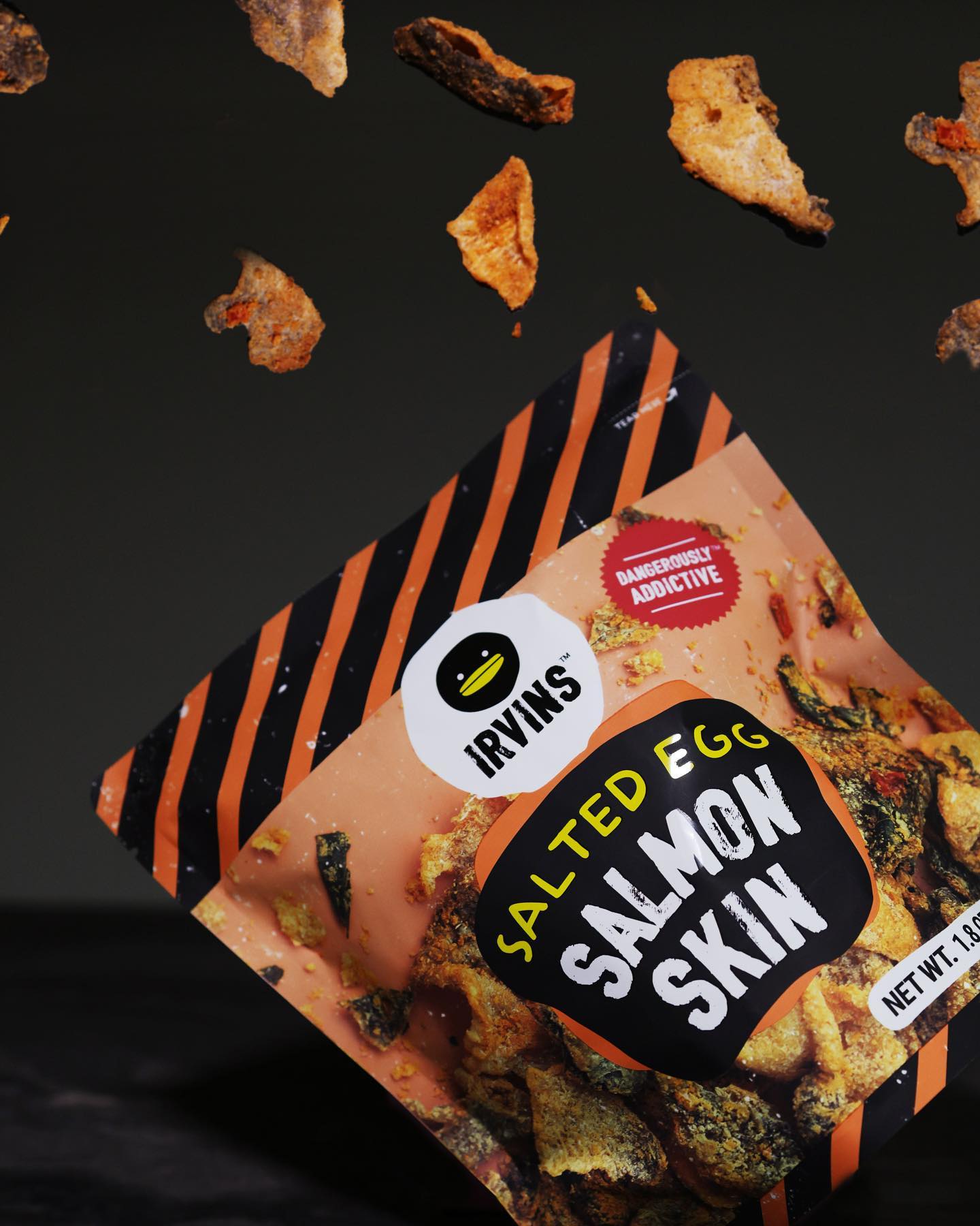 Nếu bạn đang cần tìm một chút mới lạ trong câu chuyện tình với IRVINS thì nắm tay bạn snack da cá hồi trứng muối này về nha. Da cá hồi thơm thơm, mang vị