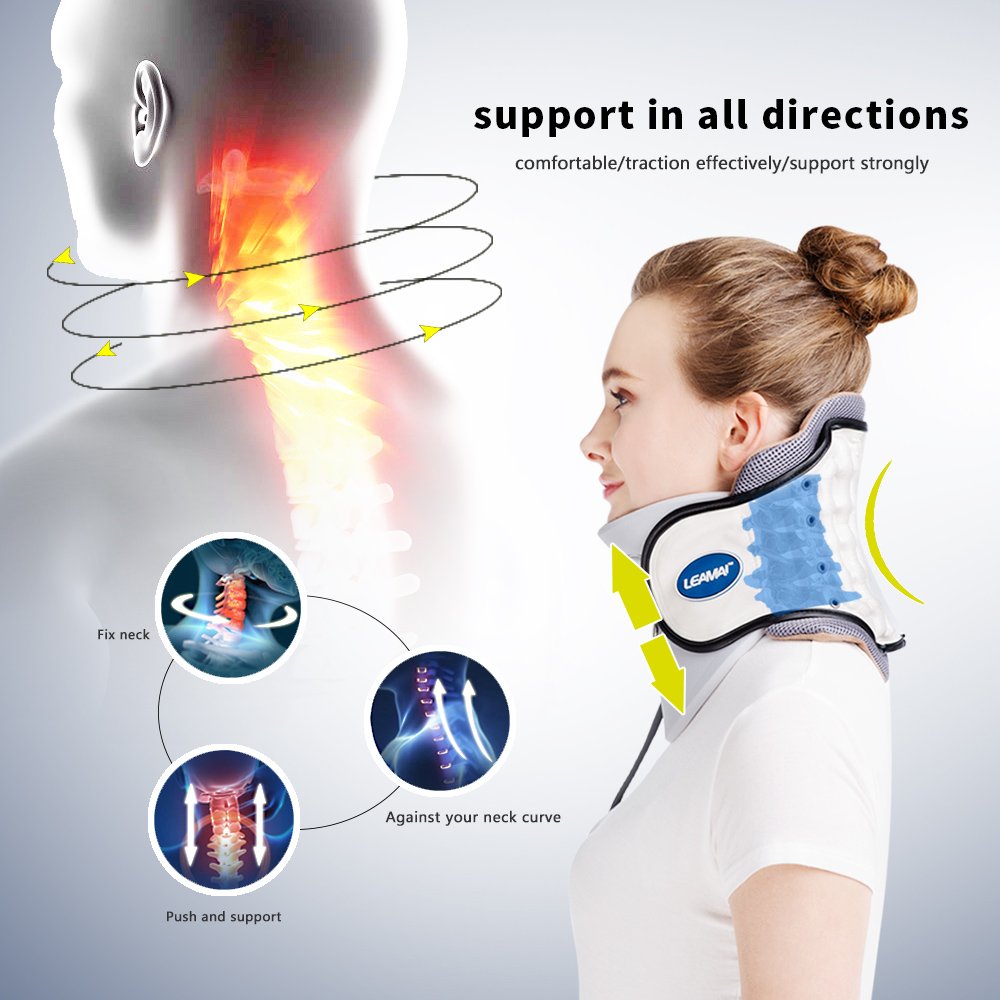 Kéo giãn cột sống cổ để giảm và hỗ trợ điều trị đau cổ là một giải pháp kỹ thuật đã được chứng minh bởi các chuyên gia y tế. Vì vậy bạn có thể đeo đai kéo giãn để hỗ trợ điều trị bệnh đau đốt sống cổ của bạn mà không cần thu.ốc hoặc phẫu thuật. Chỉ cần quấn đai kéo giãn quanh cổ của bạn, lắp van bơm và bơm không khí vào đai. Đai được giãn theo chiều dọc các đốt sống cổ làm kéo giãn khe hở giữa các đốt sống cổ ra (3mm) một cách nhẹ nhàng.