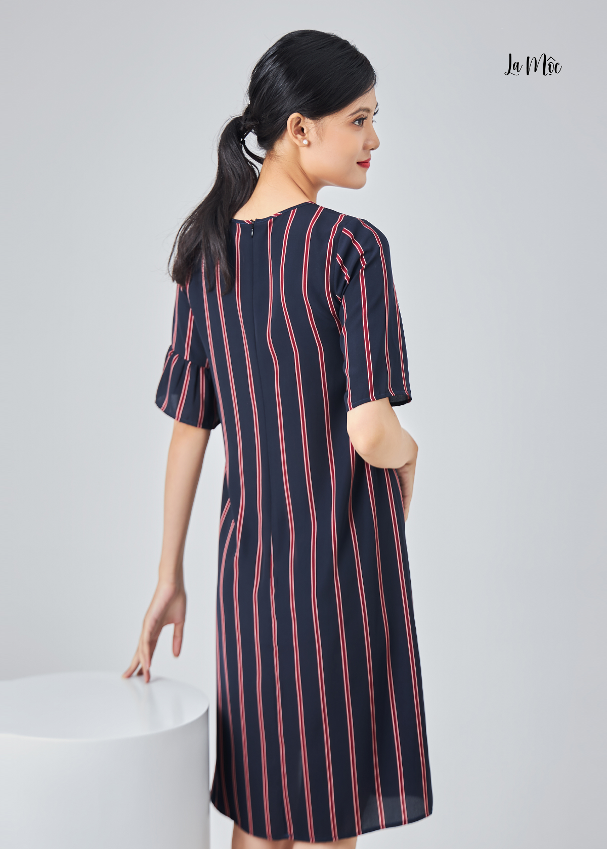 Mua tại TiktokĐầm lụa La Mộc cổ tròn, chất liệu lụa Korea, hoạ tiết sọc dọc tím trắng đỏ, cúp cách điệu nhún nhẹ phần chân váy và phần hông.