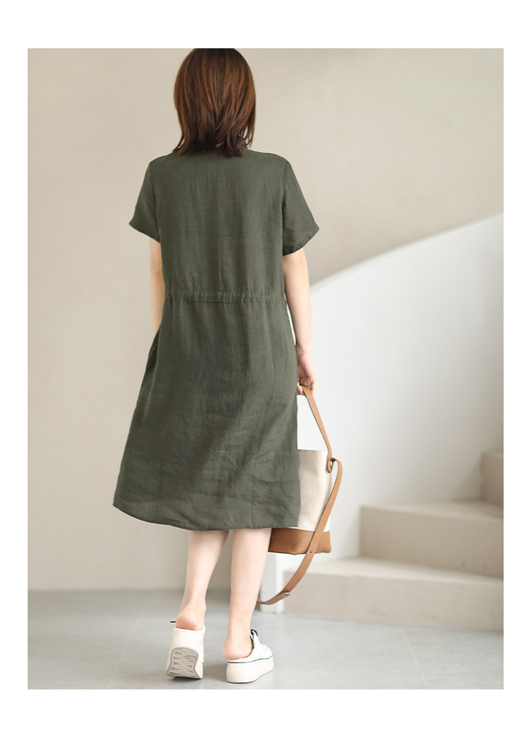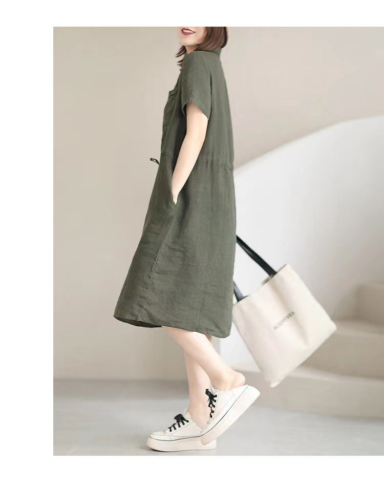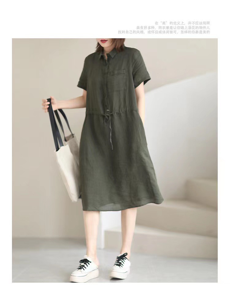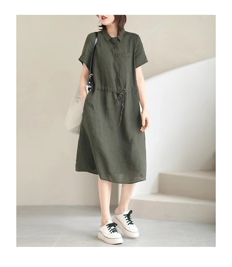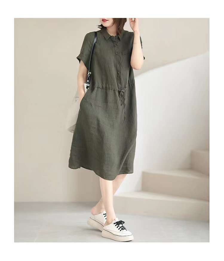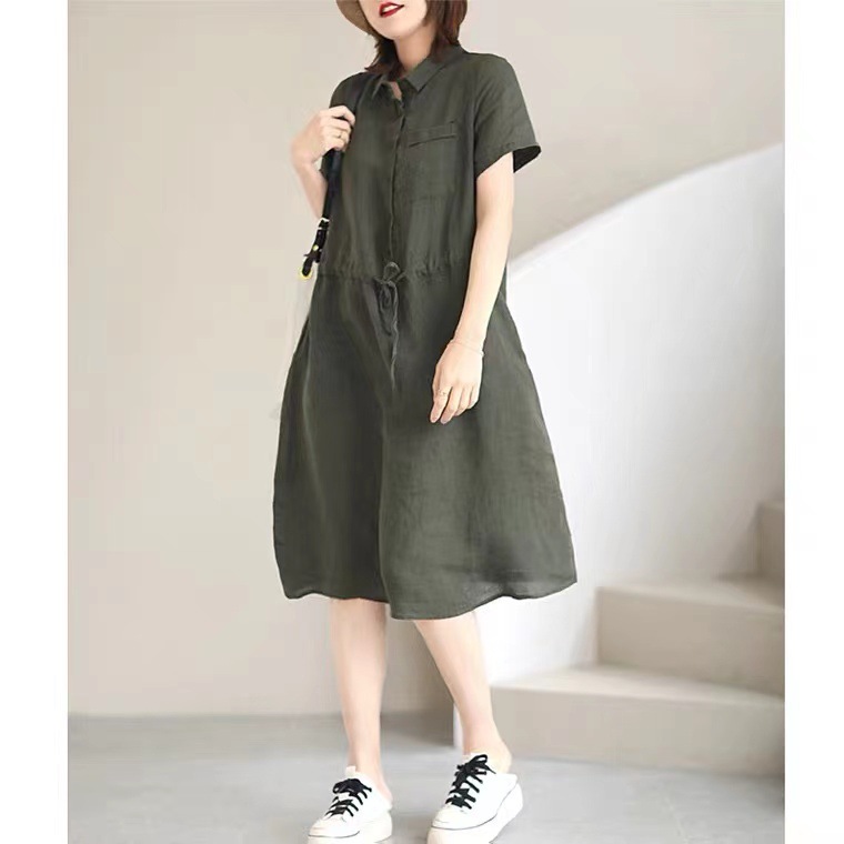 ✨Đầm sơ mi nữ form suông ngắn tay, Đầm đũi nữ cổ sơ mi kèm dây thắt eo màu rêu Da75