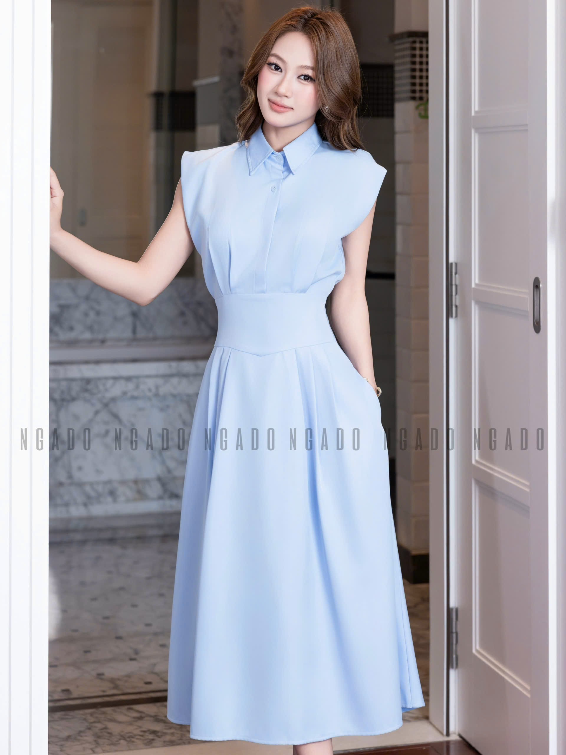 ✨Đầm sơ mi xanh biển xếp ly NGADO , đầm dáng dài , đầm kiểu , đầm sơ mi