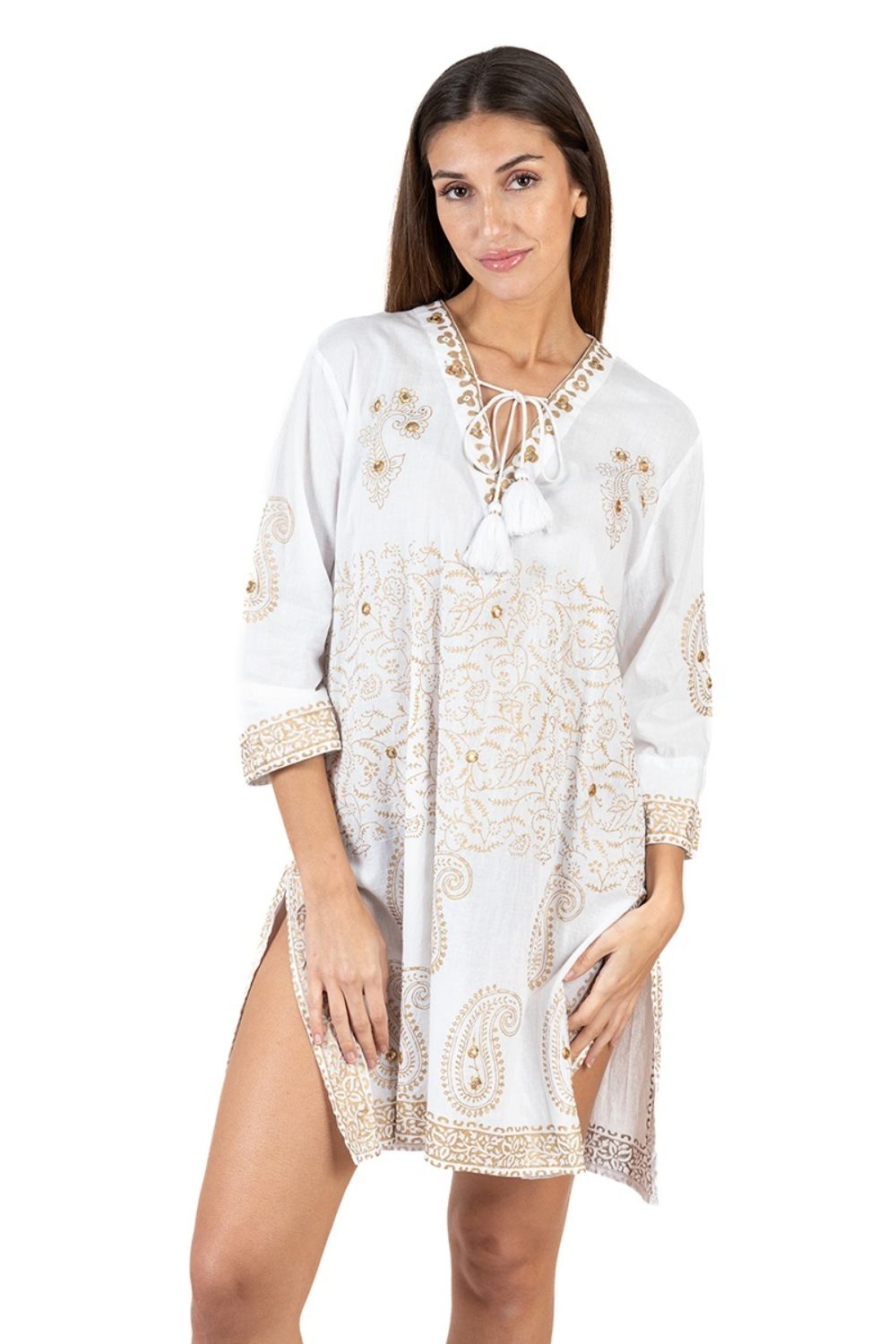 ✨Đầm Trắng Xẻ Tà Vẽ Ánh Kim Cotton Isla Bonita