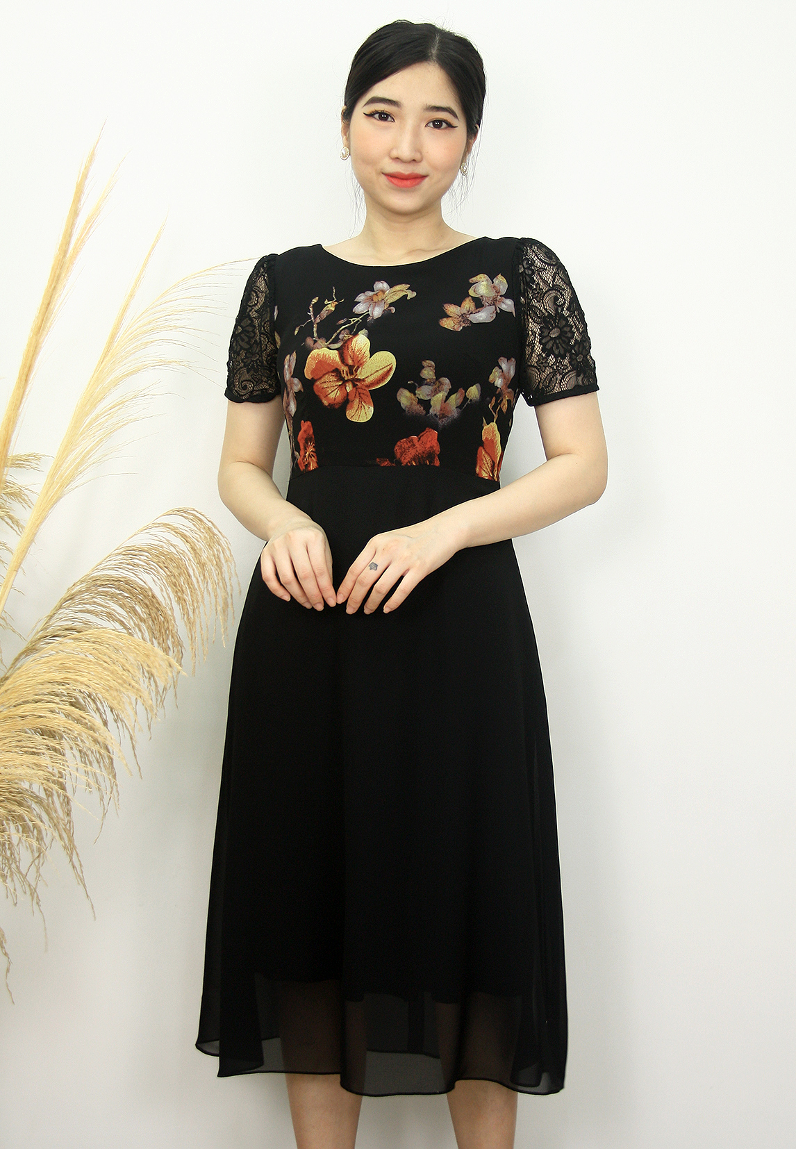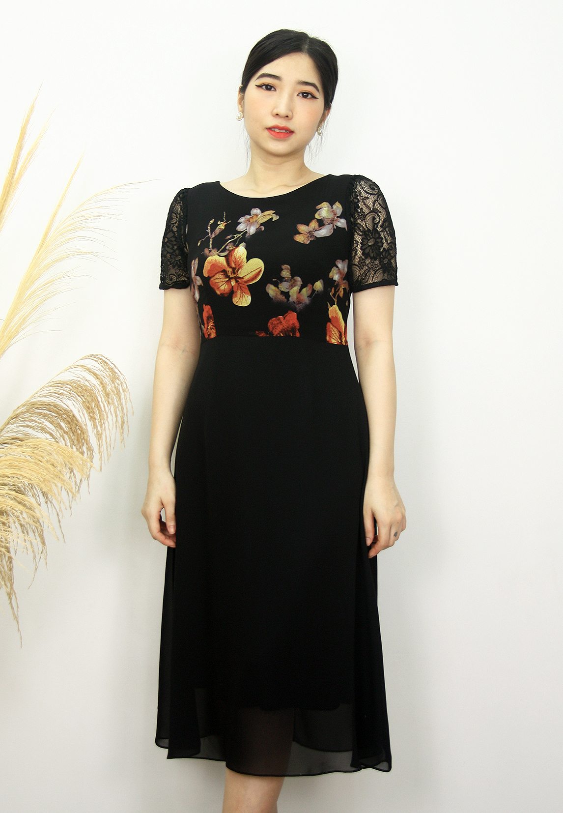 Thiết kế đầm dáng xòe A thoải mái, mang lại cho người mặc sự thanh lịch, dịu dàng. Họa tiết hoa nhẹ nhàng, dễ phối với nhiều loại phụ kiện. Cổ tròn đơn giản, tay lỡ phối ren sang trọng.