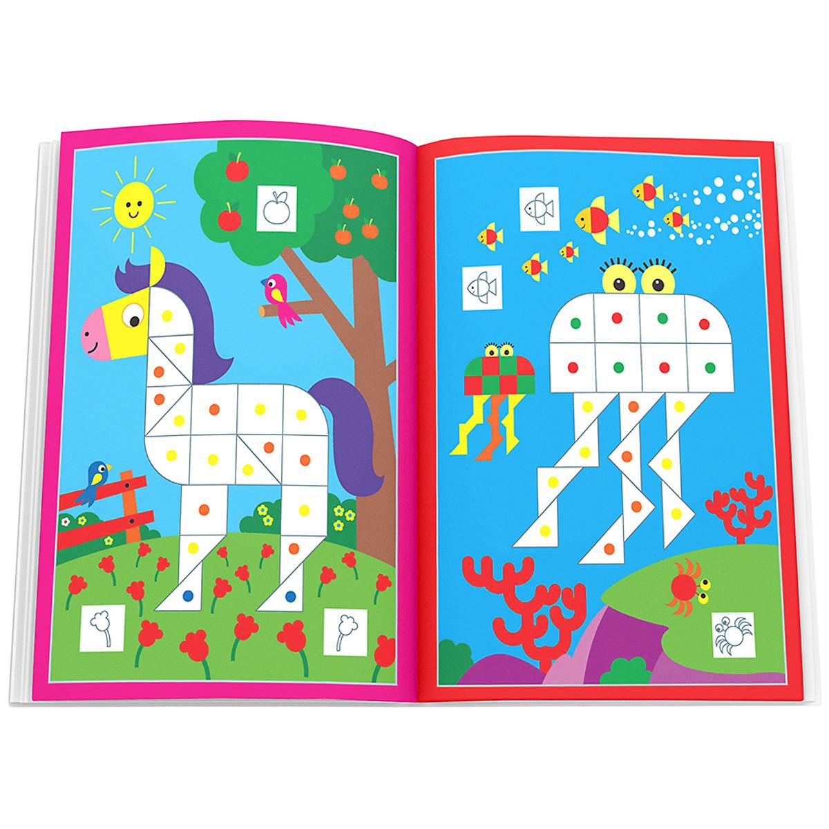 Trong mỗi cuốn sách chơi mà học này, trẻ sẽ thấy 8 bức tranh và các bức tranh ấy sẽ đẹp hơn rất nhiều nếu trẻ dùng các mảnh giấy được dính ở giữa sách để ghép vào những chỗ chưa có màu. Bằng việc chọn ra những mảnh giấy có hình dáng và màu sắc như được hướng dẫn trong mỗi bức tranh và dính vào đúng vị trí, trẻ sẽ hoàn thiện được các bức hình ngộ nghĩnh, sống động về thiên nhiên, cuộc sống. Bạn cũng có thể tham gia cùng trẻ, để trẻ thêm tự tin, hứng thú và sáng tạo tốt hơn.