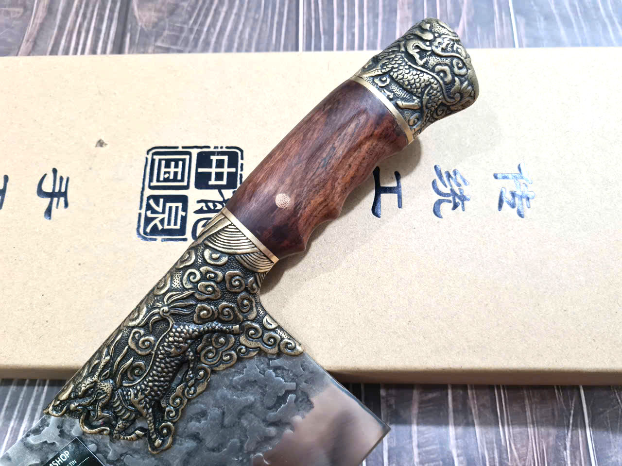 Chất liệu tay cầm: gỗ CẨM LAI, khâu và chuôi cuối dao bằng đồng thau
