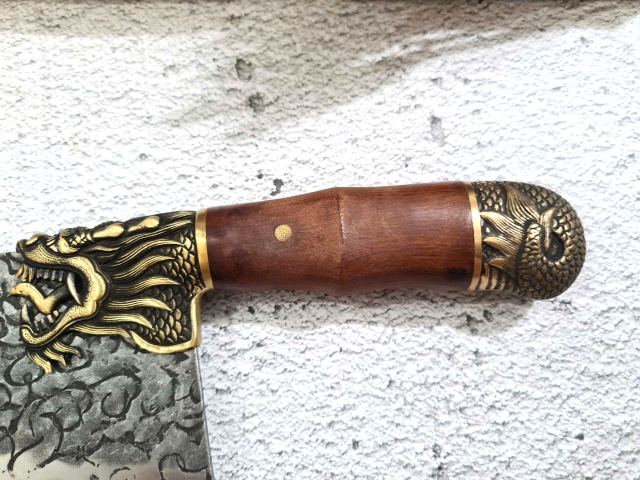 Chất liệu tay cầm: gỗ CẨM LAI, khâu và chuôi cuối dao bằng đồng thau