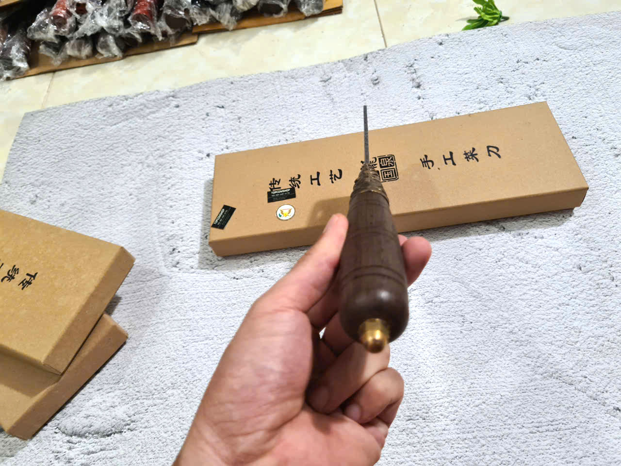 Chất liệu tay cầm: gỗ CÁNH GÀ, khâu và chuôi cuối dao bằng đồng thau