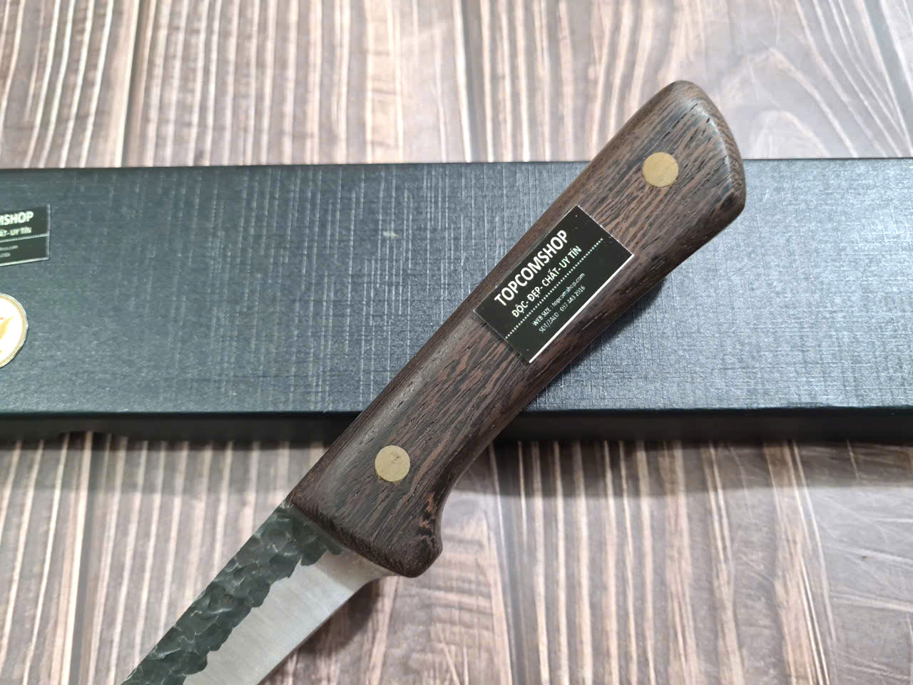 • Chất liệu: Thép Nhật 420J2, độ cứng 53HRC – siêu bền, chống gỉ • Lưỡi dao: Dày 2.5mm, sắc bén, hoàn thiện bằng đá mài nước • Tay cầm: Gỗ Pakka sang trọng, chống