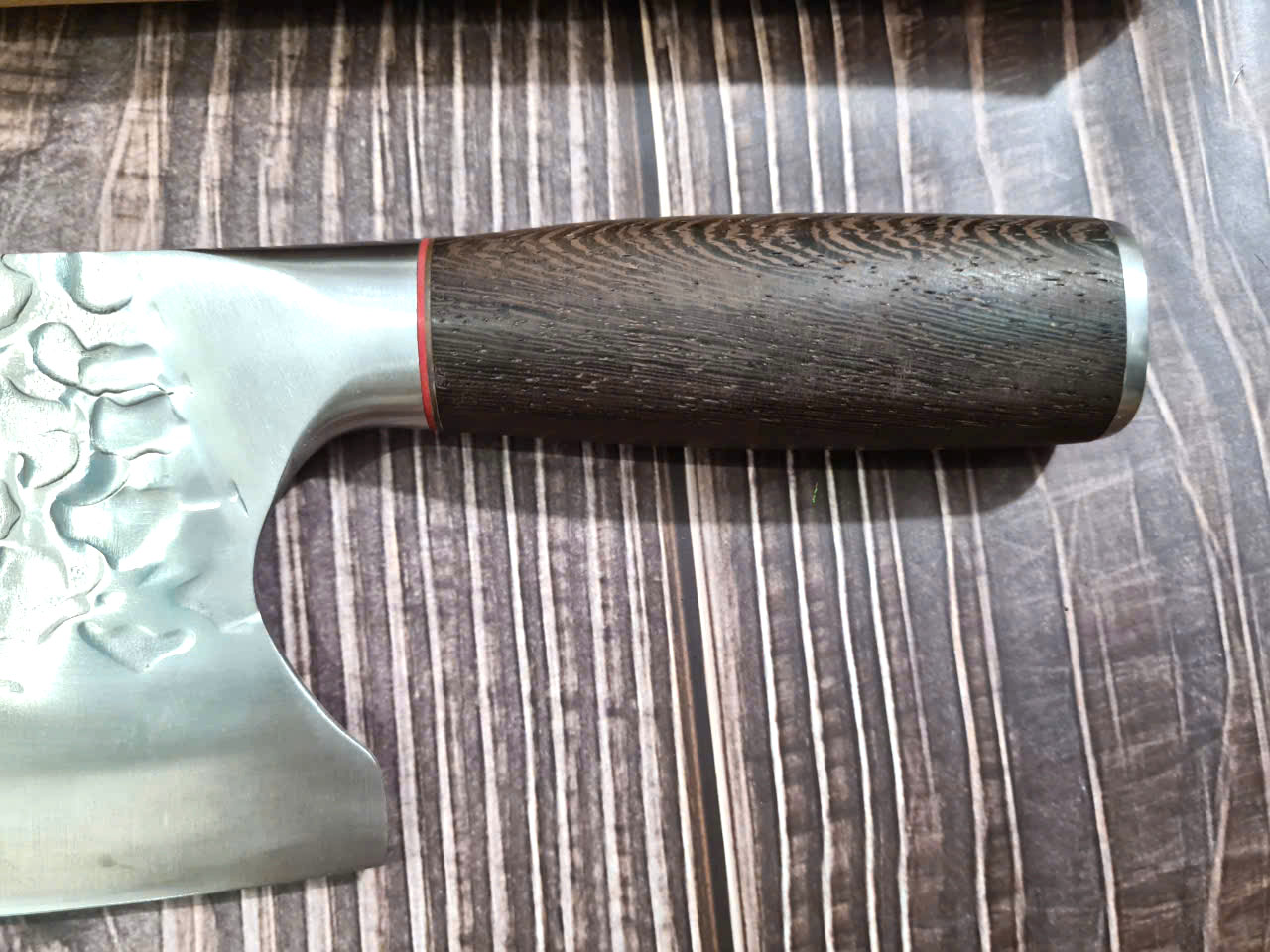 - Chức năng: Chặt xương ống, chân giò, trâu bò - Kích thước: Lưỡi: 22cm, cán: 10cm, rộng: 10cm, dầy: 5ly, trọng lượng: 800g - Cán : Gỗ mun, Khâu đồng đỏ , chốt đinh