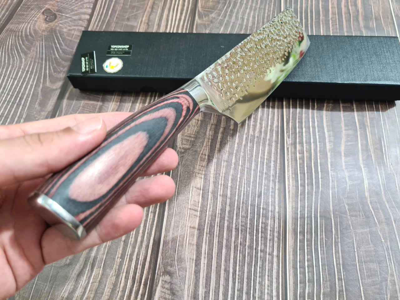 - Chức năng: thái thịt, rau củ quả - Kích thước: Lưỡi: 17cm, cán: 12cm, rộng: 5cm, dầy: 1ly, trọng lượng: 200g - Cán : Gỗ cẩm chỉ, Chốt, Khâu ĐỒNG ĐỎ , keo liên