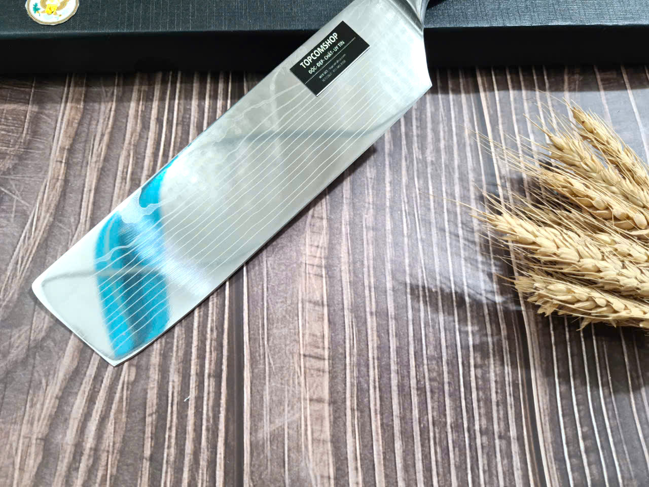 - Chức năng: thái thịt, rau củ quả - Kích thước: Lưỡi: 17cm, cán: 12cm, rộng: 5cm, dầy: 1ly, trọng lượng: 200g - Cán : Gỗ cẩm chỉ, Chốt, Khâu ĐỒNG ĐỎ , keo liên