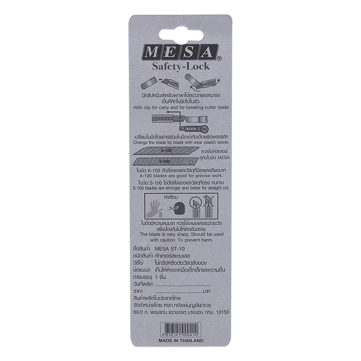 Dao Rọc Giấy Mesa ST-10 Dao rọc giấy mesa ST-10 được làm từ chất liệu thép cao cấp, không gỉ, sắc bén, độ bền cao. Cán dao được bọc kim loại cứng cáp, chịu được