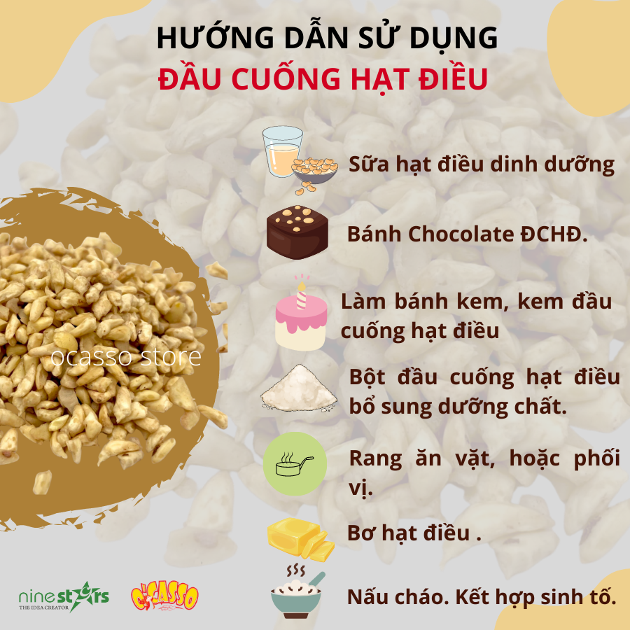 Mua tại TiktokĐầu cuống hạt điều hay còn gọi là đầu mầm hạt điều, là một phần rất nhỏ của hạt điều, mỗi hạt điều chỉ có một đầu cuống duy nhất. Tuy nhỏ nhưng đầu cuống hạt điều là phần chứa nhiều dinh dưỡng hơn phần nhân và cực kỳ thơm ngon. Hiện nay, các tập đoàn lớn sản xuất sữa hạt tại Mỹ và Châu Âu đang sử dụng phần đầu cuống làm nguyên liệu để sản xuất bánh kẹo, sữa bột hoặc sữa nước cung cấp thực phẩm dinh dưỡng bổ sung.